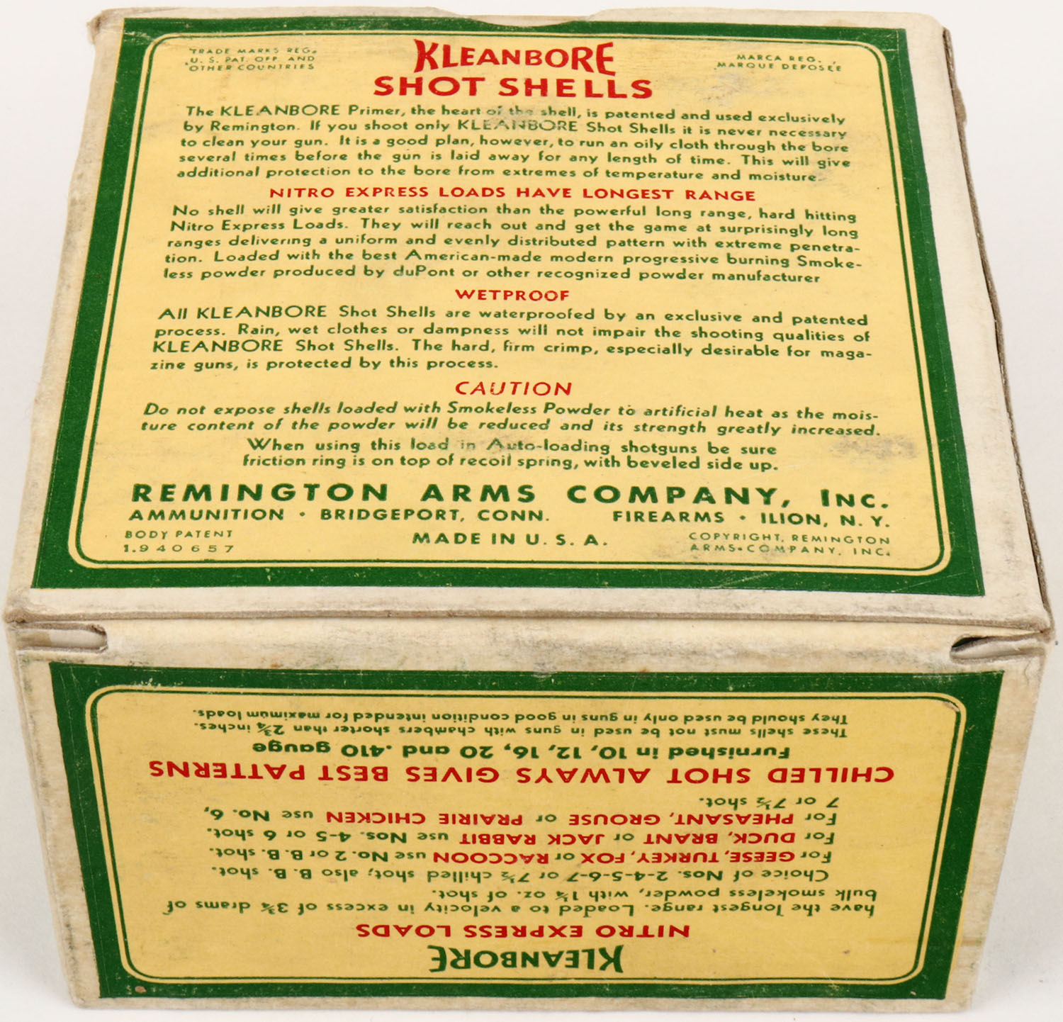 Remington, Kleanbore, NITRO EXPRESS, 12ga., 1pc., Full, shot size 7C, box is yellow, red and green, box is solid with very nice colors, shells are very good. Grade: Very Good ++ - Value: 10 to 30