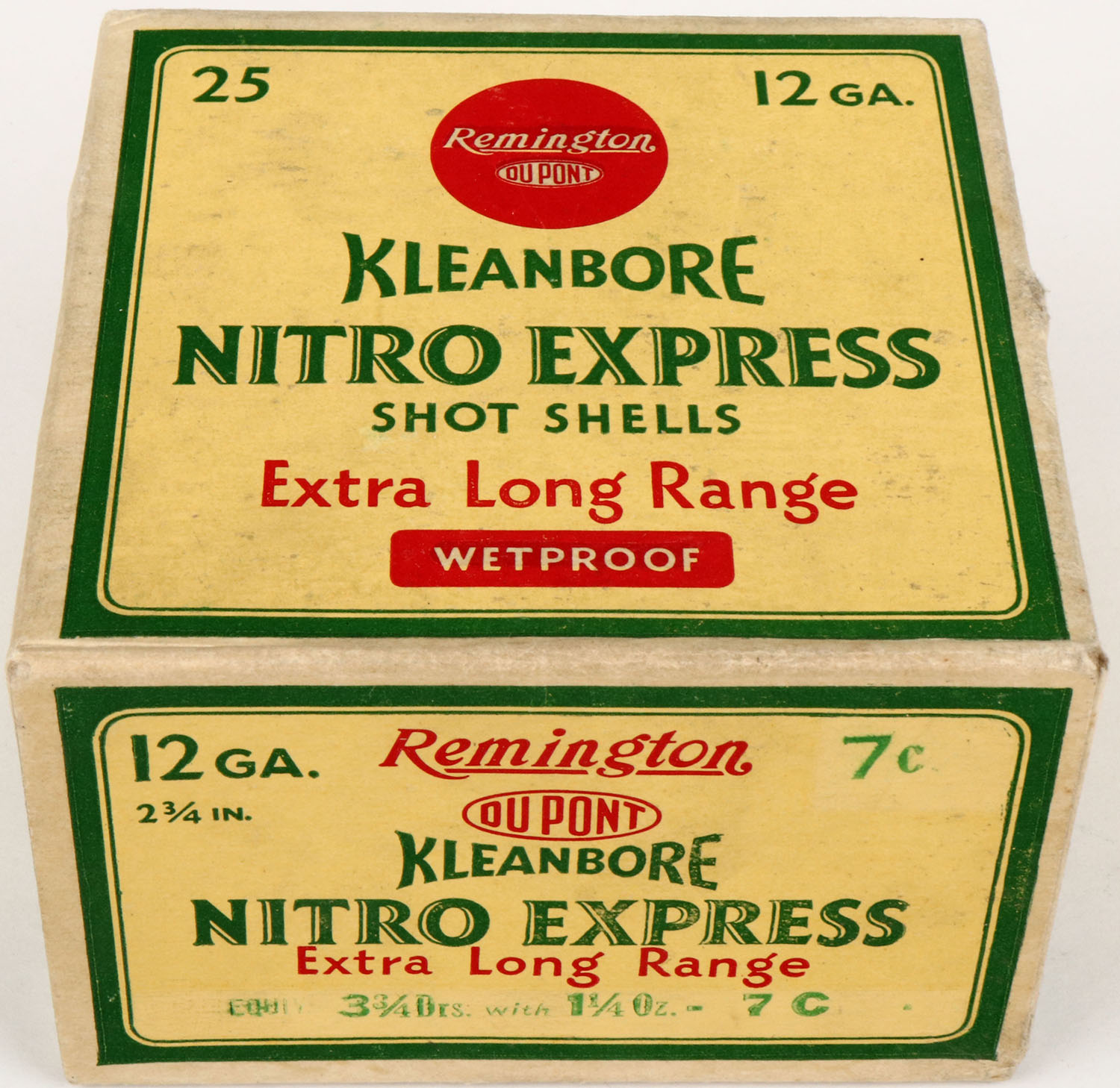 Remington, Kleanbore, NITRO EXPRESS, 12ga., 1pc., Full, shot size 7C, box is yellow, red and green, box is solid with slight shell protrusions, great colors, shells are excellent. Grade: Excellent + - Value: 10 to 50