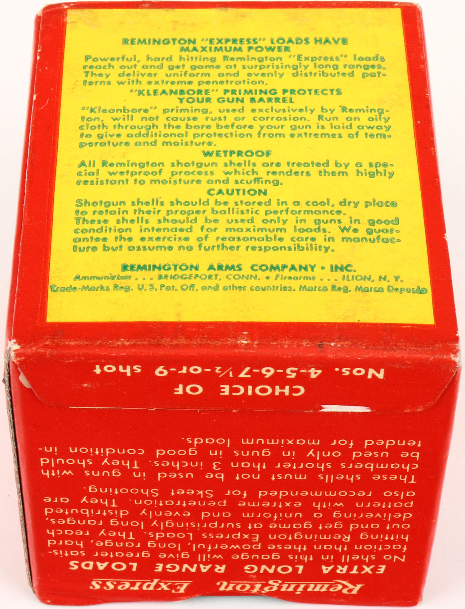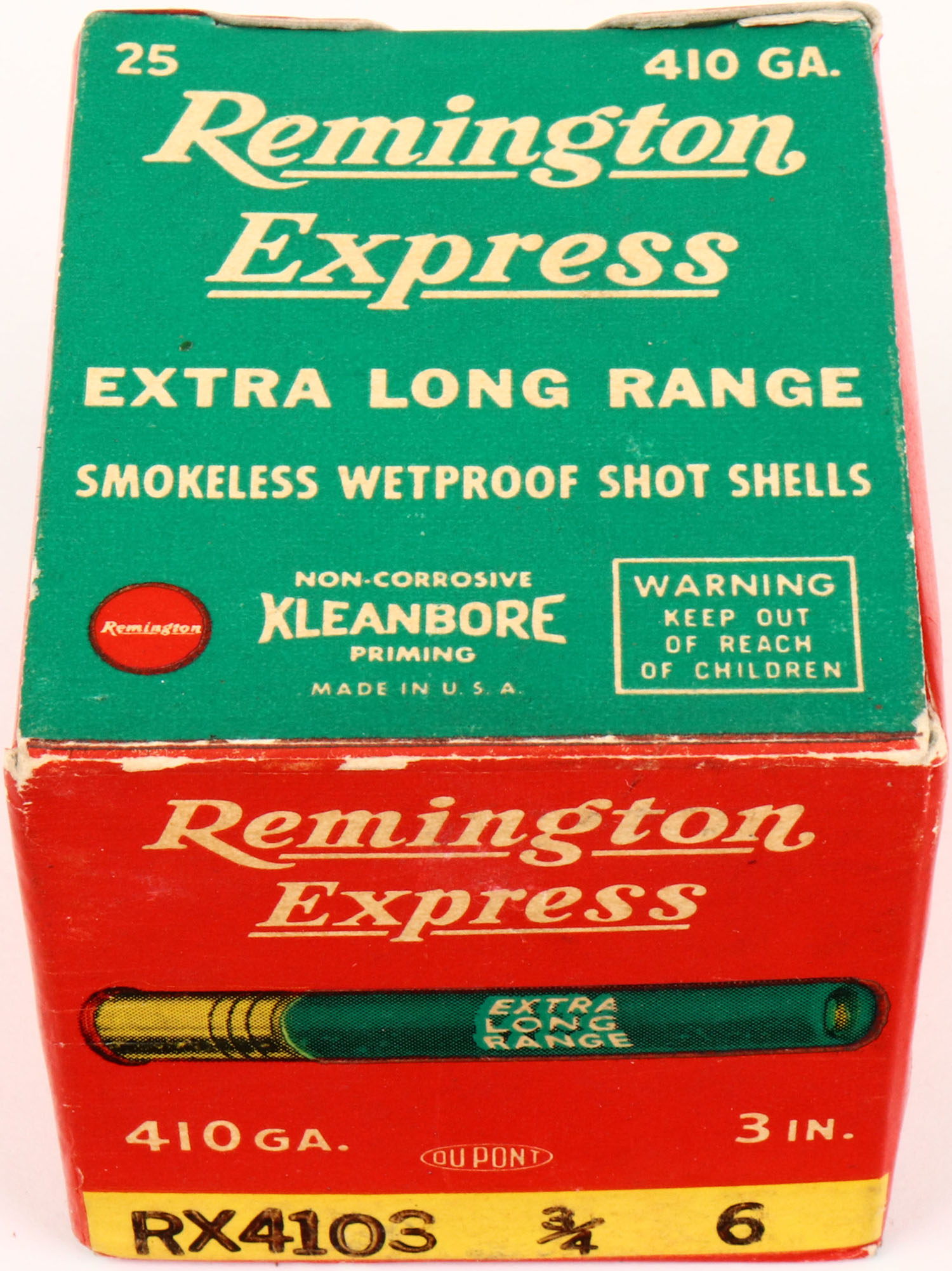 Remington, Express Extra Long Range, 410ga., 1pc., Full, shot size 6, red and green box, 3'', box is very solid with excellent colors, shells are excellent. Grade: Excellent ++ - Value: 20 to 40