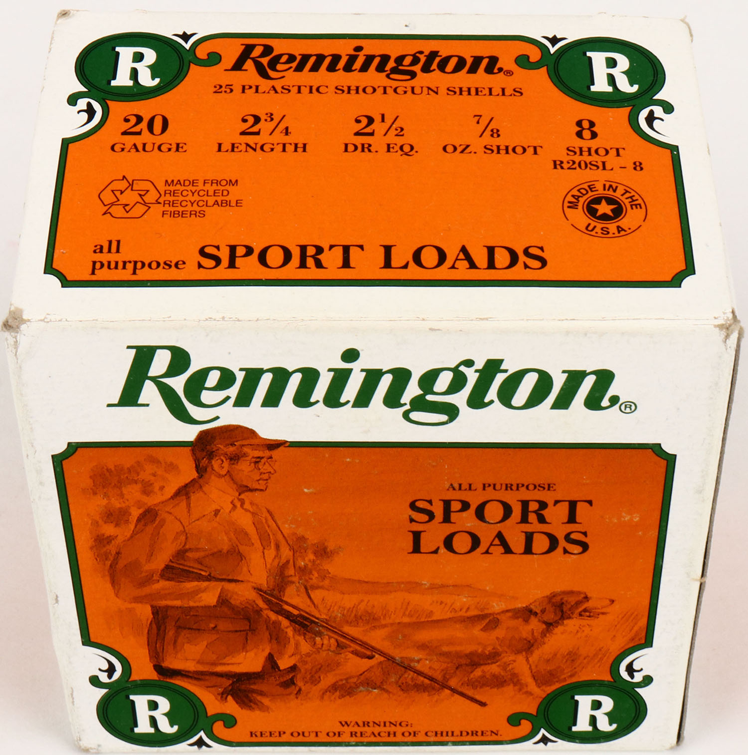Remington, Sport Loads, 20ga., 2 3/4'', 1pc., Full, shot size 8, green, orange & white box, box has great color, shells are excellent. Grade: Excellent ++ - Value: 8 to 20