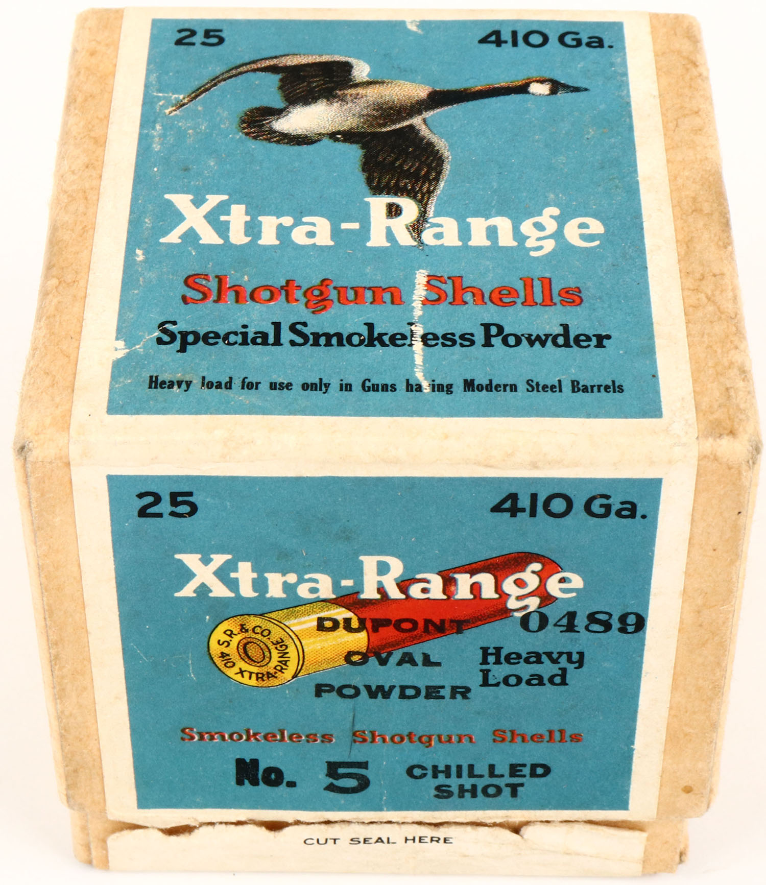Sears Roebuck and Co., XTRA-RANGE, 410ga., 2pc., Full of random shot size with seven being correct, shot size 5 Chilled Shot, buff box with multi colored label that pictures a Goose flying, with little edge wear, shells are excellent. Grade: Excellent - Value: 100 to 250