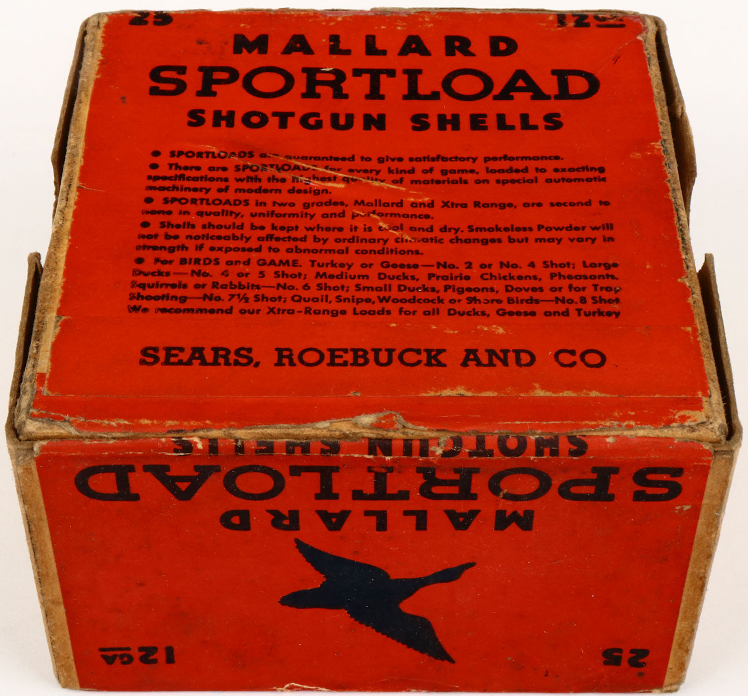 Sears, Sportload MALLARD, 12ga., 2pc., Empty, shot size 5ch, red & blue box that pictures a Mallard in flight, box is very solid with nice color has light age soiling. Grade: Very Good ++ - Value: 40 to 100