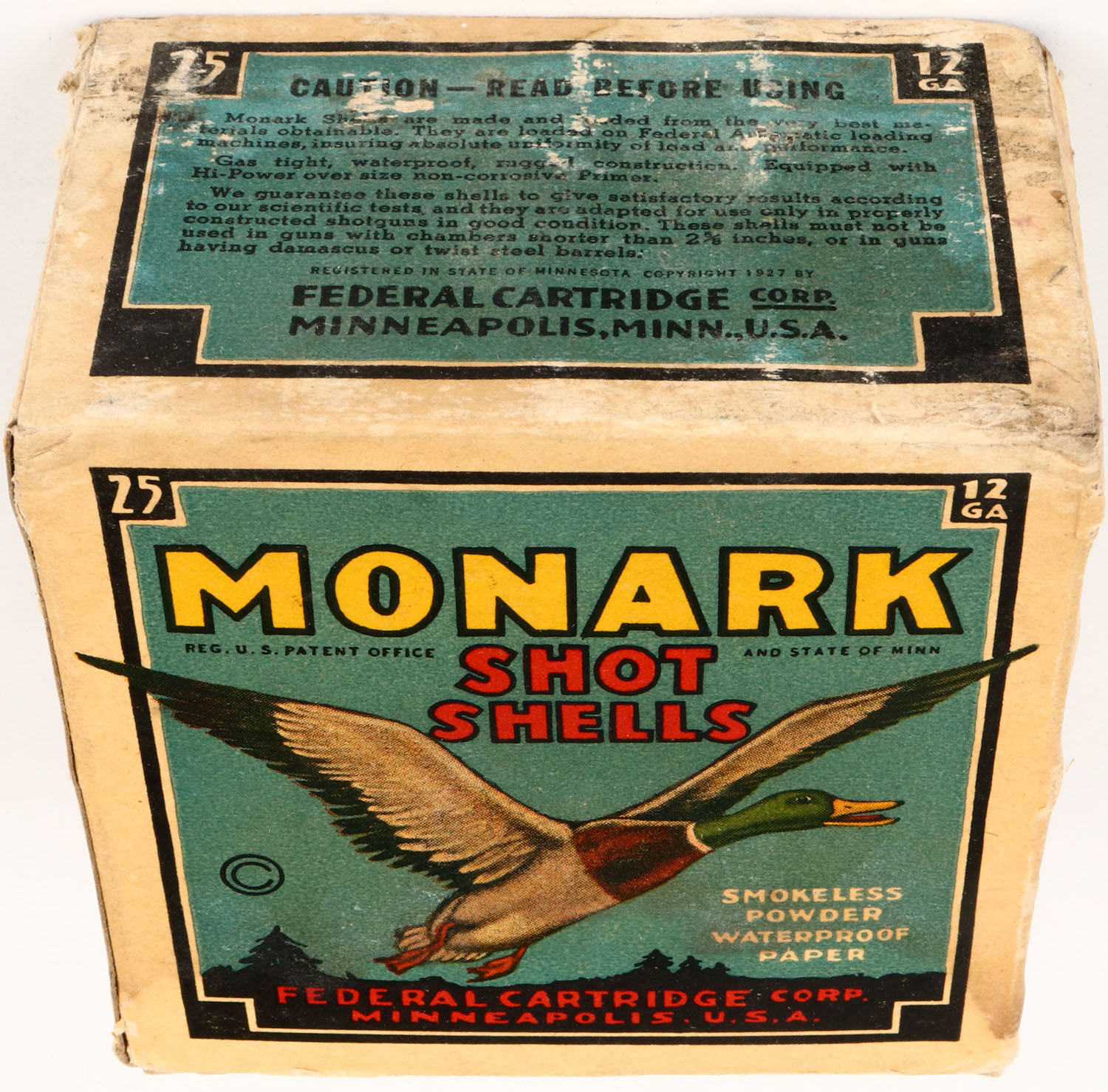 Federal Cart. Co., MONARK, U.S Property, 12ga., 1pc., Full, shot size 8ch, Black border, blue, yellow and red box with flying mallard, box has light shell protrusions, light age soiling, light scuffing, is solid with very nice color, shells are very good. Grade: Very Good ++ - Value: 16 to 40