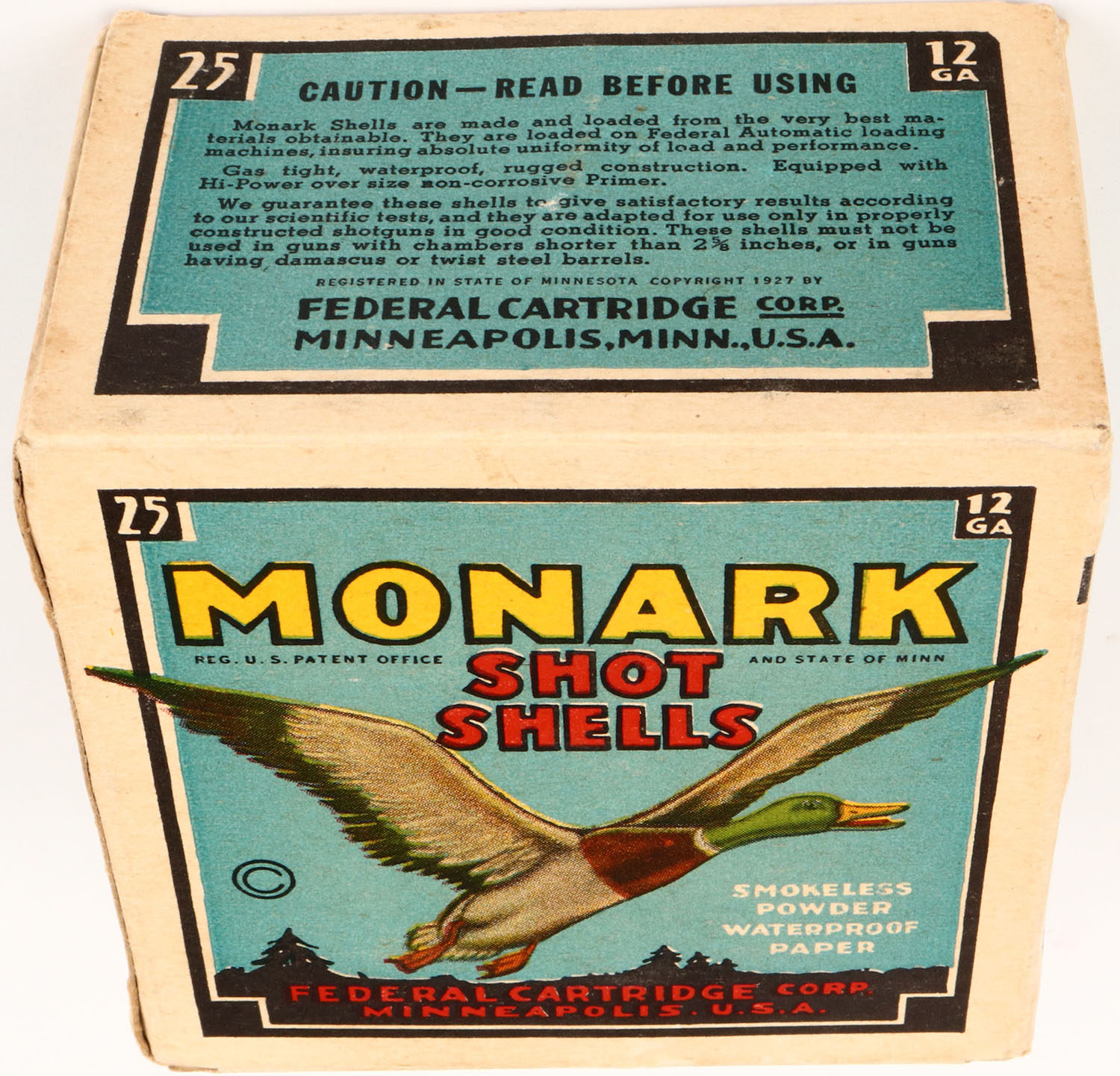 Federal Cart. Co., MONARK, 12ga., 1pc., Full, shot size 8, Black border, blue, yellow and red box with flying mallard, box is solid with great color, shells are very good. Grade: Excellent - Value: 16 to 40