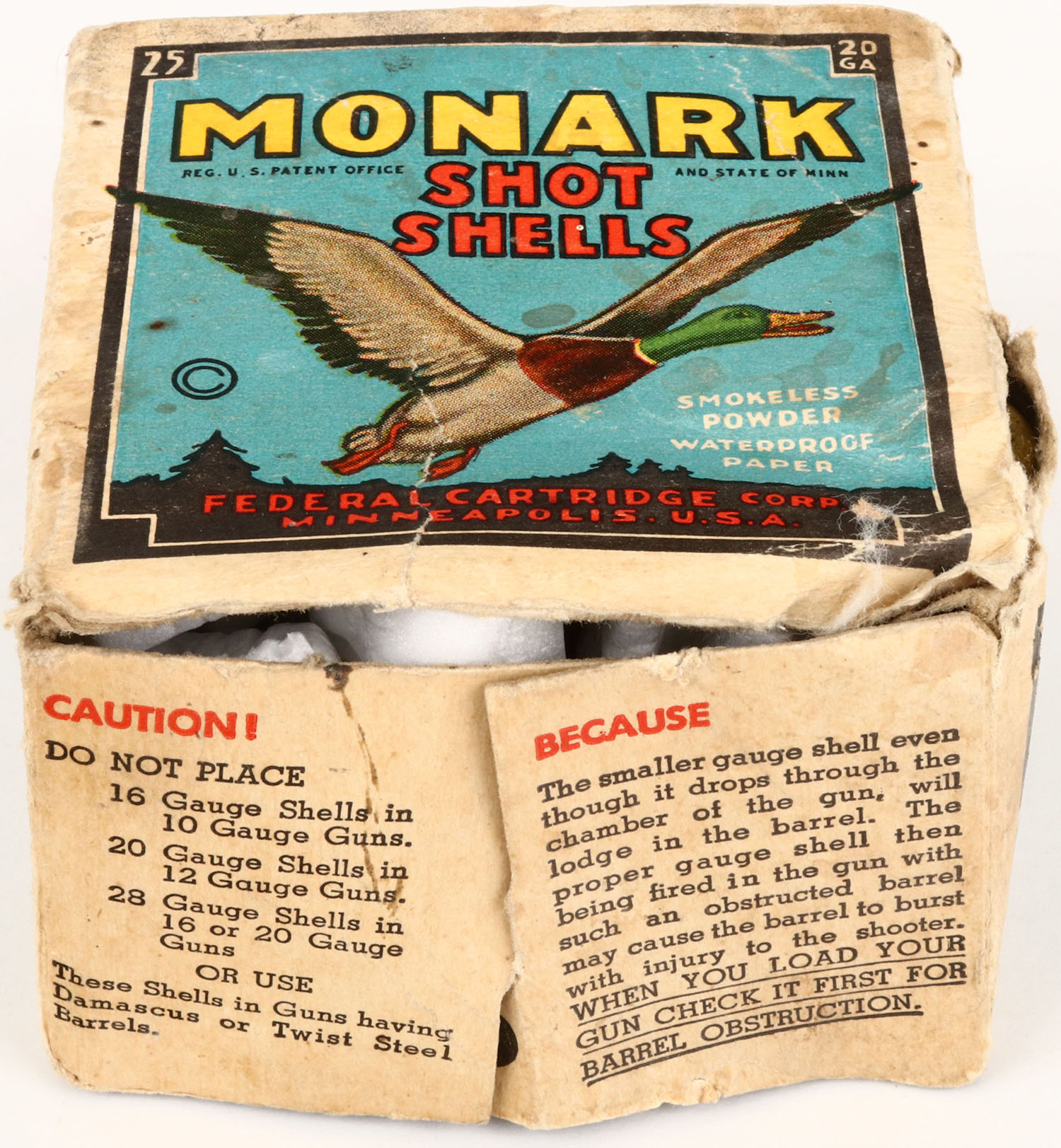 Federal Cart. Co., MONARK, 20ga., 1pc., Partial 18rds, shot size ?, Black border, blue, yellow and red box with flying mallard, box has no top flap, has shell protrusions, age soiling, scuffing, small tear with nice color, shells poor. Grade: Very Good - Value: 8 to 20