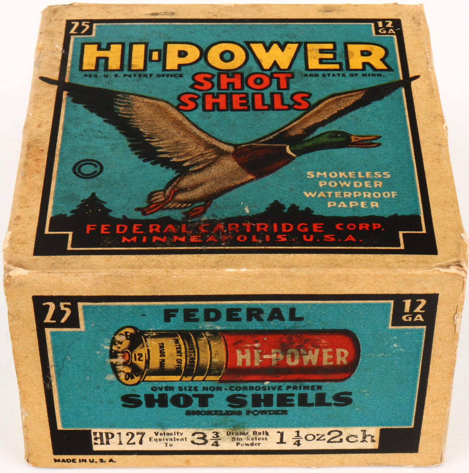 Federal Cart. Co., HI-POWER with insert, 12ga., 1pc., Full, shot size 2ch, Black border, blue, yellow and red box with flying mallard, box has scuffing with light age soiling is solid with very nice color, shells are very good. Grade: Very Good ++ - Value: 10 to 30