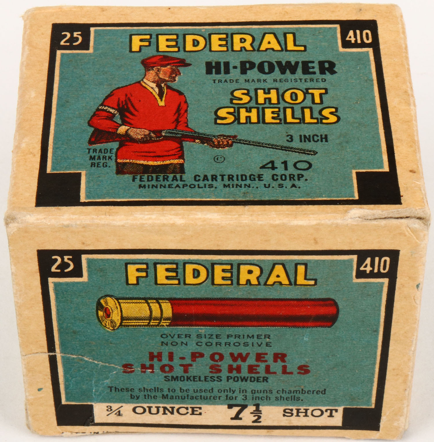 Federal Cart. Co., HI-POWER, 410ga., 1pc., Full, shot size 7 1/2, Black border, blue, yellow and red box that pictures trap shooter with red sweater & cap, box inside flap is torn, has tape repair with great colors, shells are very good. Grade: Excellent - Value: 16 to 60