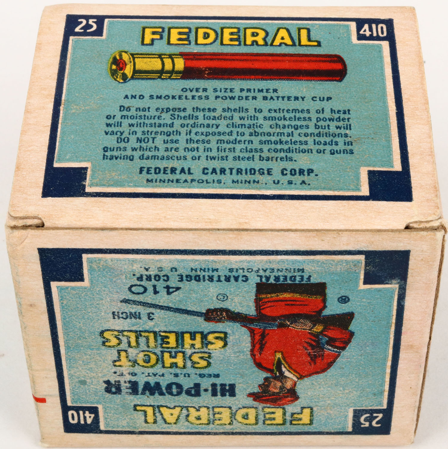 Federal Cart. Co., HI-POWER, 410ga., 1pc., Full, shot size 6, Blue border, black, yellow and red box that pictures trap shooter with red sweater & cap, box has light scuffing is very solid with great colors, shells are excellent. Grade: Excellent - Value: 16 to 60