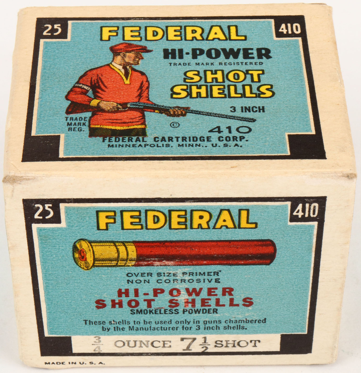 Federal Cart. Co., HI-POWER, 410ga., 1pc., Full, shot size 6, Black border, blue, yellow and red box that pictures trap shooter with red sweater & cap, box is very solid with great colors, shells are very good. Grade: Excellent + - Value: 16 to 60