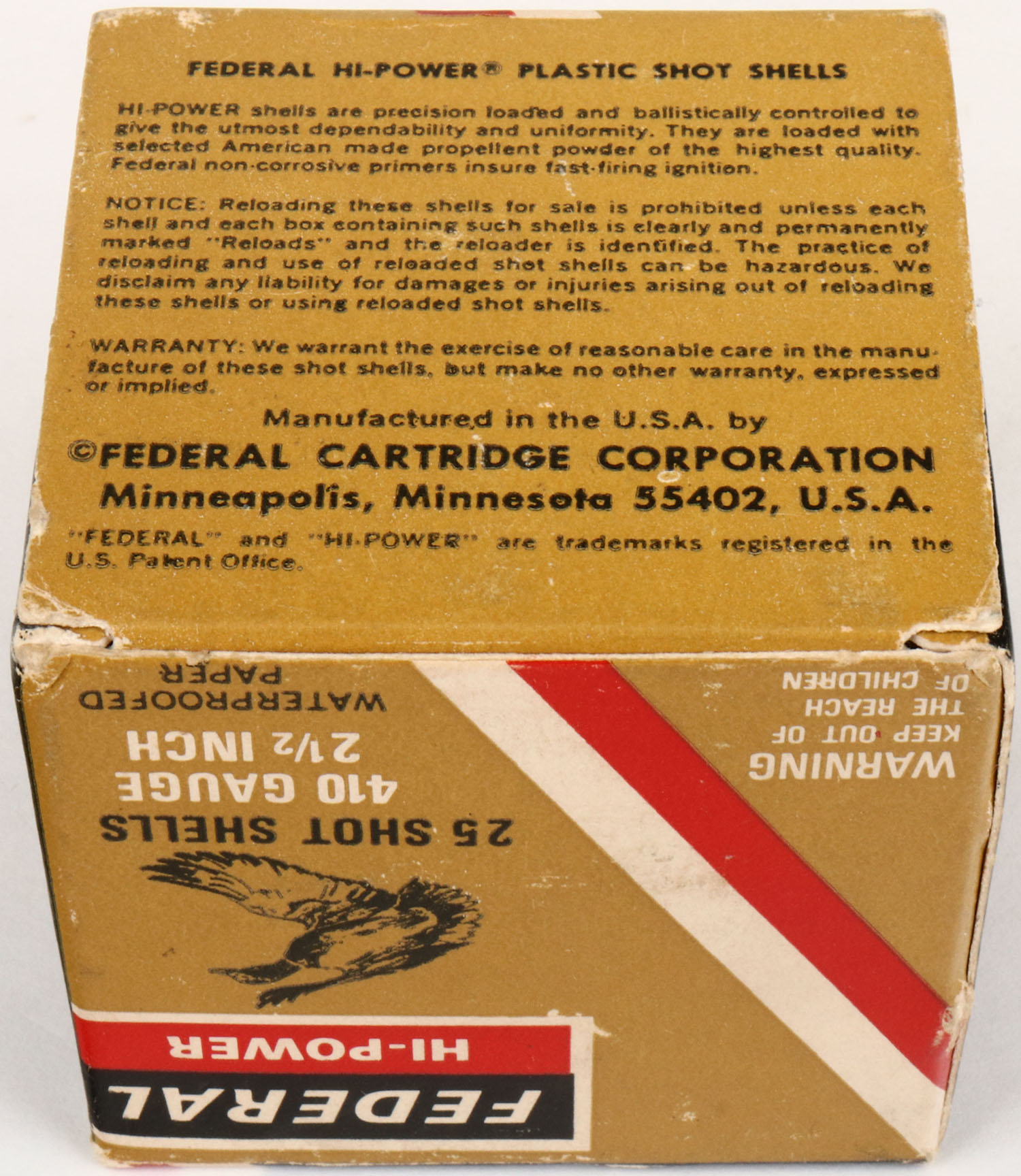 Federal, HI-POWER, 410ga., 1pc., Full, shot size 9 Skeet Load, multi-colored box, box is very solid with very nice colors, shells are excellent. Grade: Excellent ++ - Value: 10 to 30
