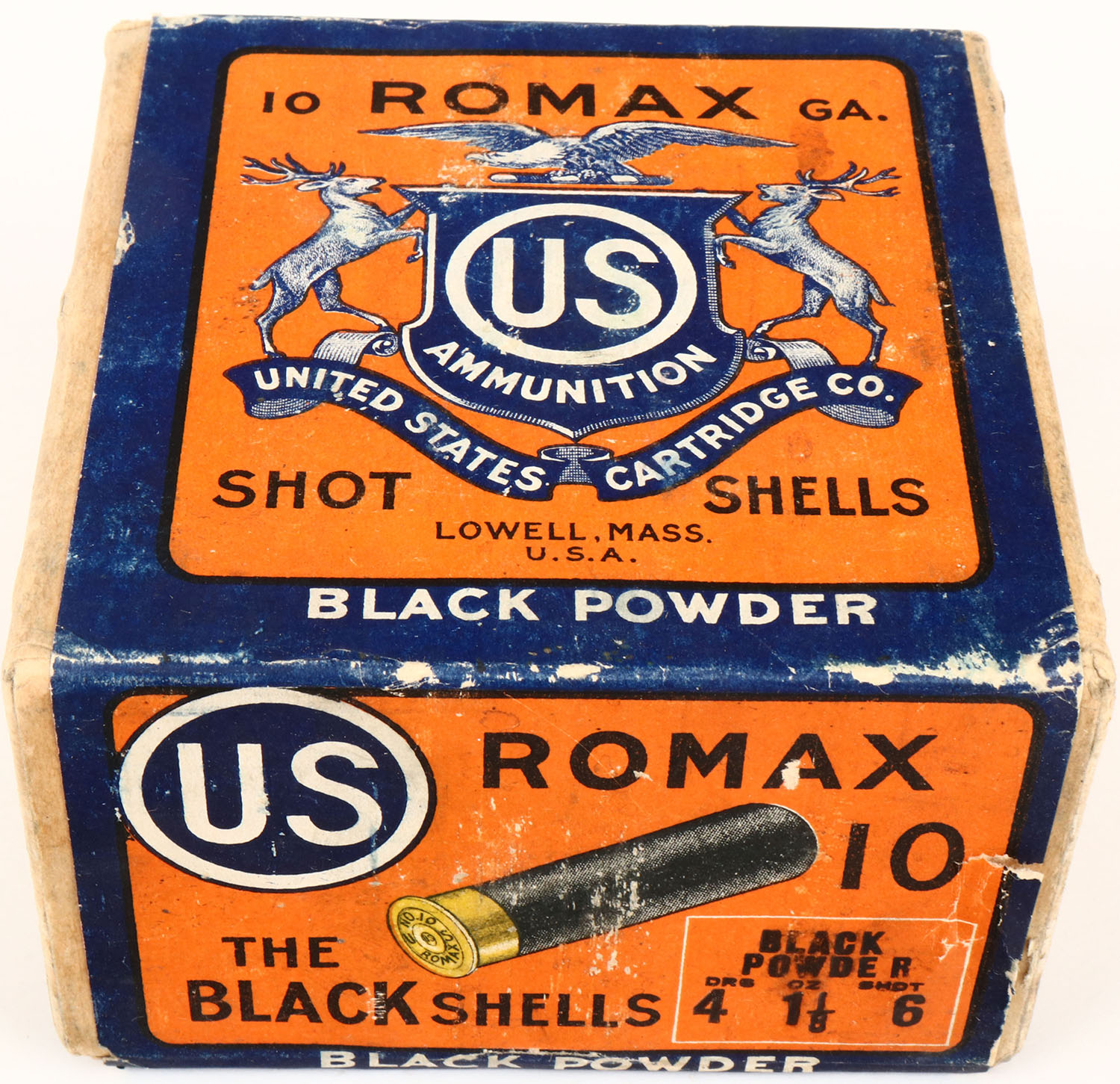 US Cart. Co., Lowell, Mass, Romax, 10ga, 2pc., FULL & SEALED, Black Powder 6 Shot, buff box orange, blue & white label, box has shell protrusions, with very nice colors. Grade: Excellent - Value: 70 to 300