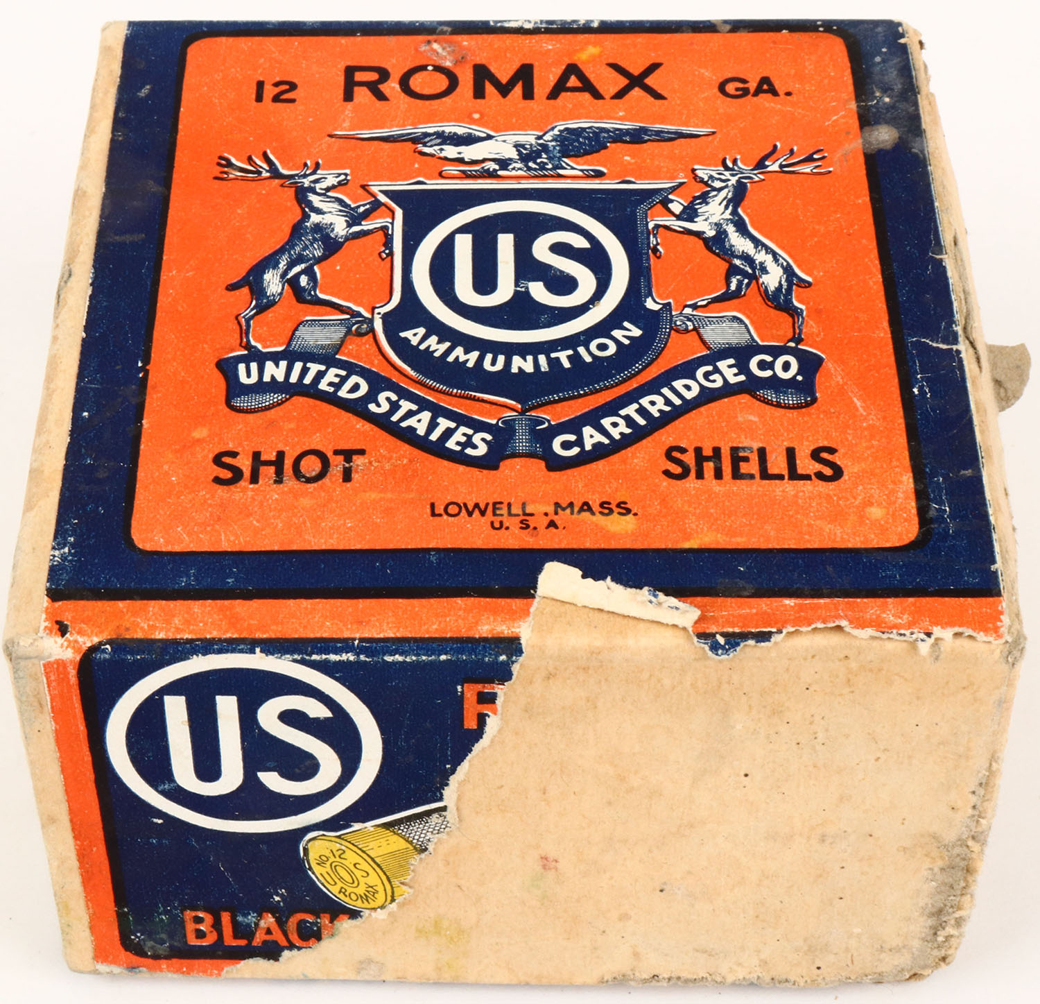 US Cart. Co., Lowell, Mass, Romax, 12ga, 2pc., Partial 16rds of incorrect ammo, Black Powder ? Shot, buff box orange, blue & white label, label is 70% intact, right side of is torn, box has seam split, shell protrusions, age soiling, with very good colors, Shells are very good. Grade: Very Good + - Value: 20 to 60
