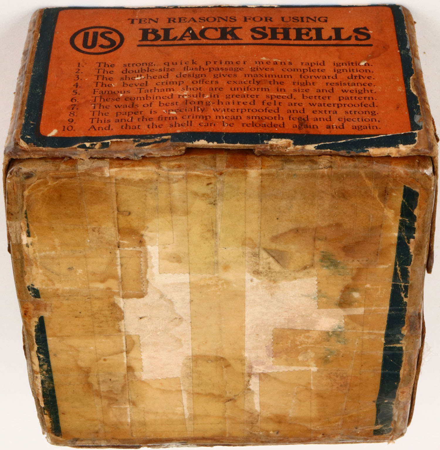 US Cart. Co., Lowell, Mass, Climax, 20ga, 2pc., shot size ? Ballistite, Full, buff box orange, blue & white label, box has tape repair, edge wear, age soiling, label is 90% intact. Shells are excellent. Grade: Very Good + - Value: 20 to 60