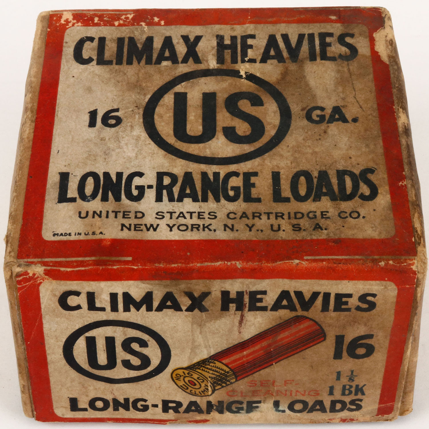 U.S. Cart. Co., New York, NY, CLIMAX HEAVIES, 16ga., 2pc., Partial 6rds, shot size 1 Buck, buff box with white, orange & blue paper label, box has seam split, age soiling, Shells are good. Grade: Very Good + - Value: 16 to 50