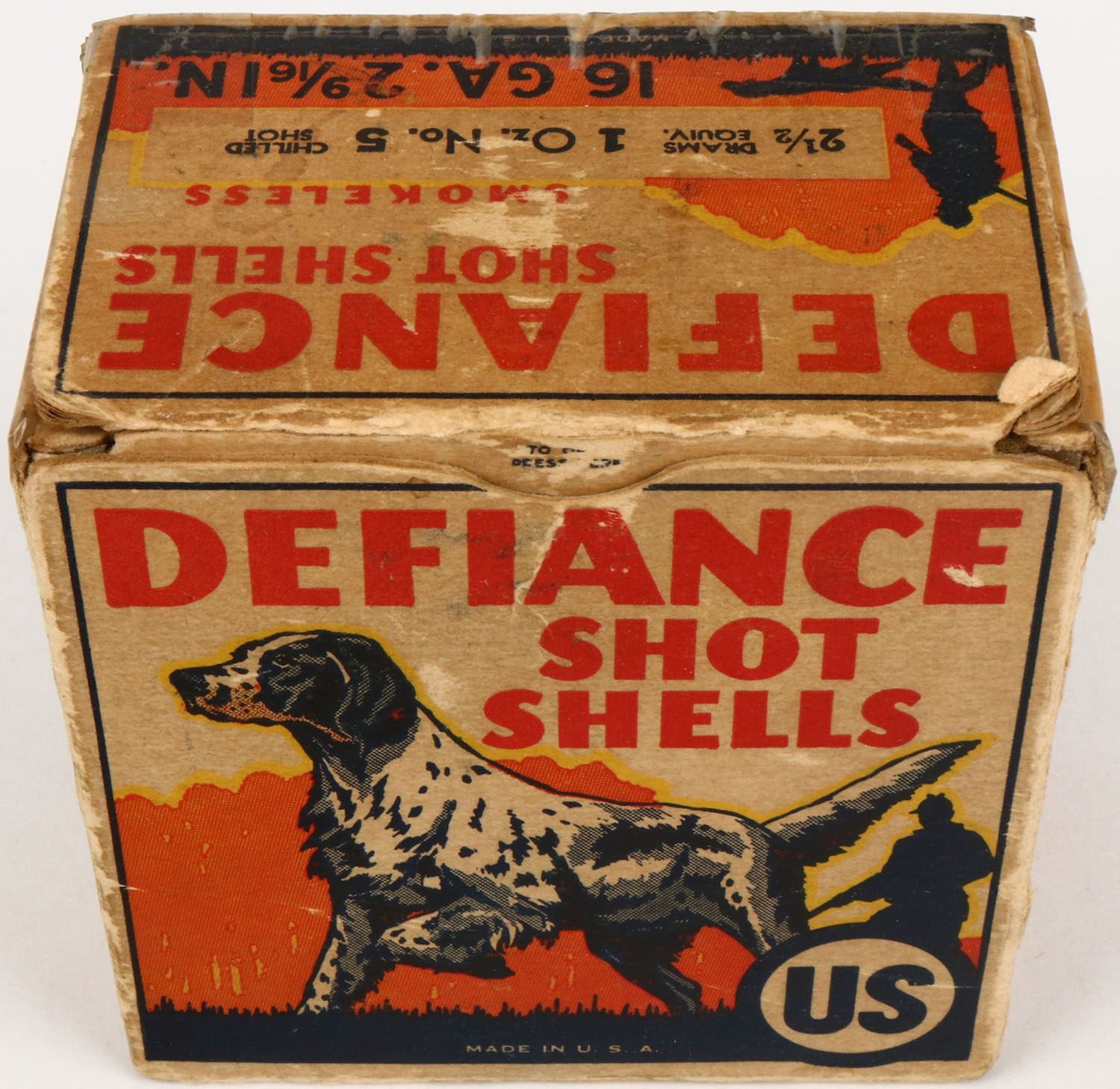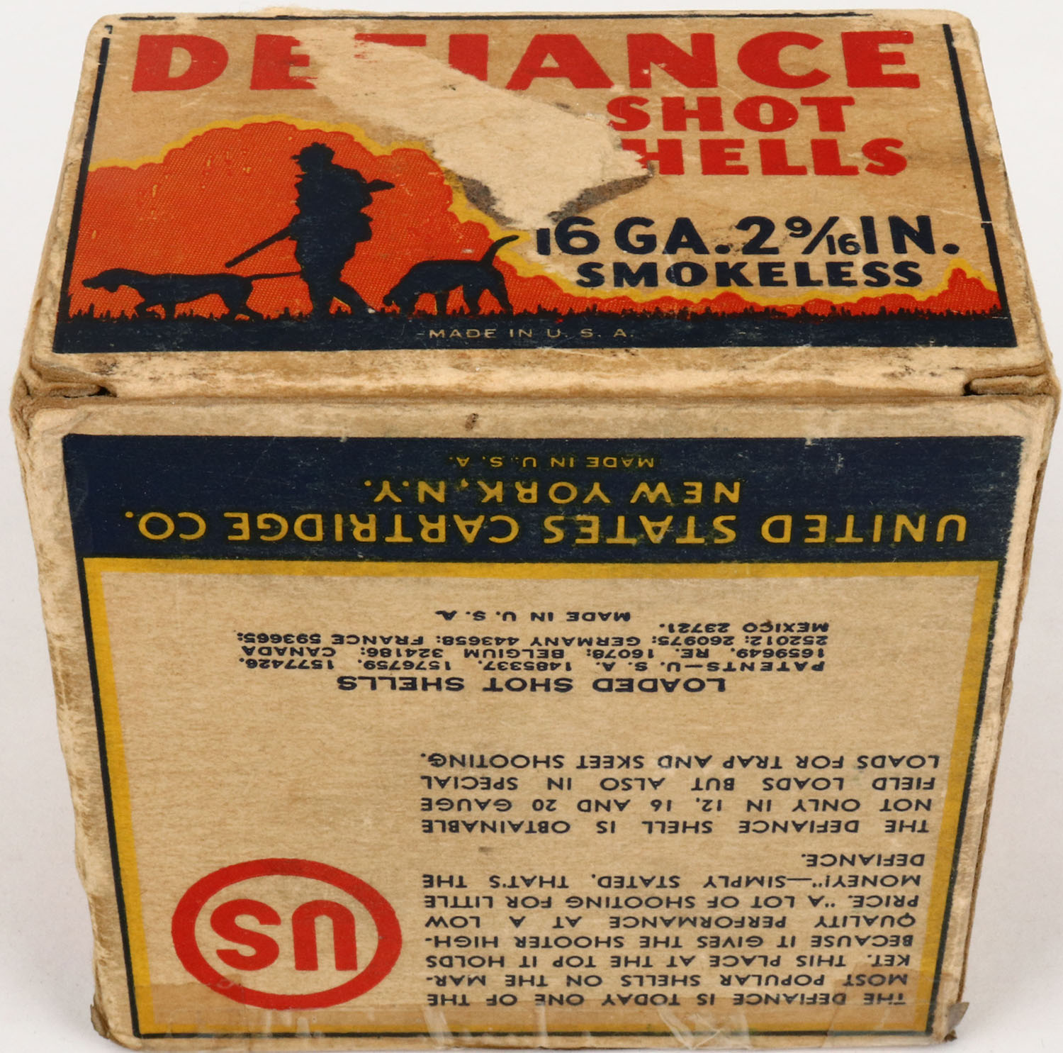 US Cart. Co., Defiance Shot Shells, 16ga., 1pc., Partial 12rds, shot size 5 Chilled Shot, 2 9/16 IN., white, blue, black, orange and yellow box, great graphics showing a dog on point with hunter in background, box has light scuffing, light age soiling, tape repairs, Shells are very good. Grade: Very Good ++ - Value: 30 to 100