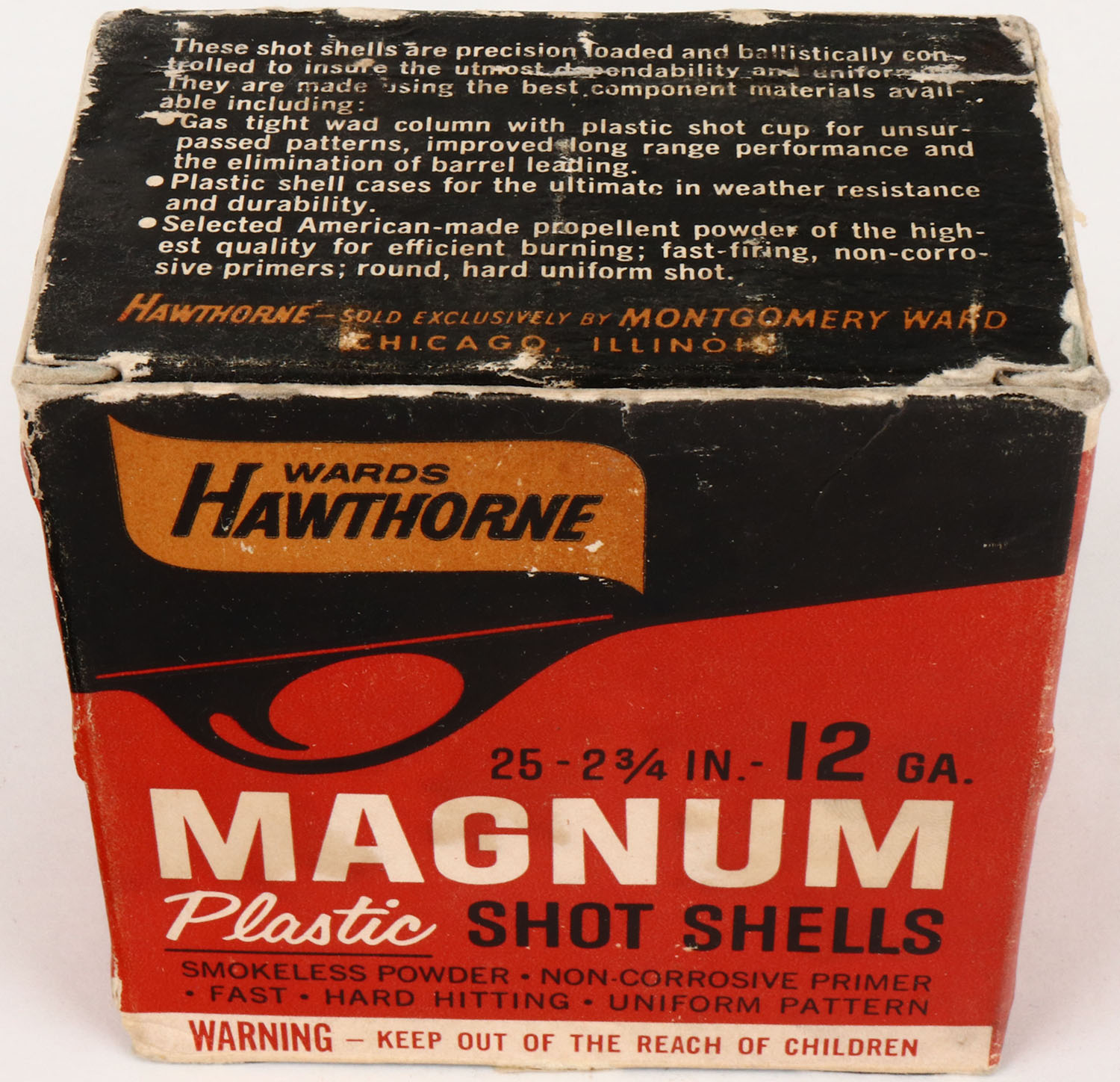 Montgomery Ward Hawthorne, 12ga., 1pc., Full, shot size 6, box is solid with very nice colors, edge wear, shells are very good. Grade: Excellent + - Value: 10 to 30
