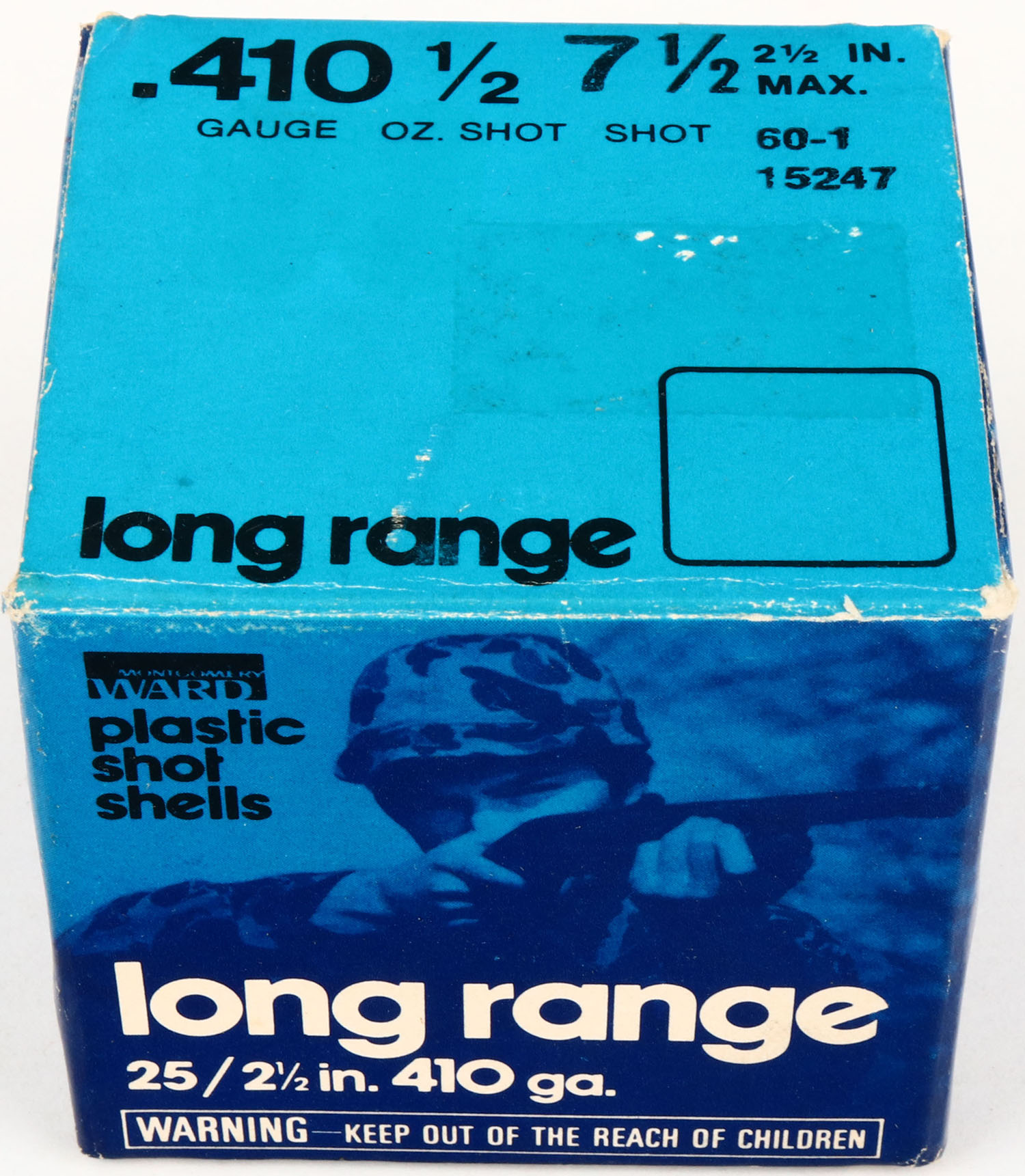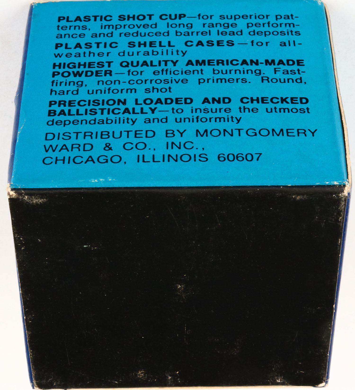 Montgomery Ward & Co., 12ga., 1pc., Full, shot size 7 1/2, blue & black box, Box is solid with excellent colors, shells are excellent. Grade: Excellent ++ - Value: 10 to 30