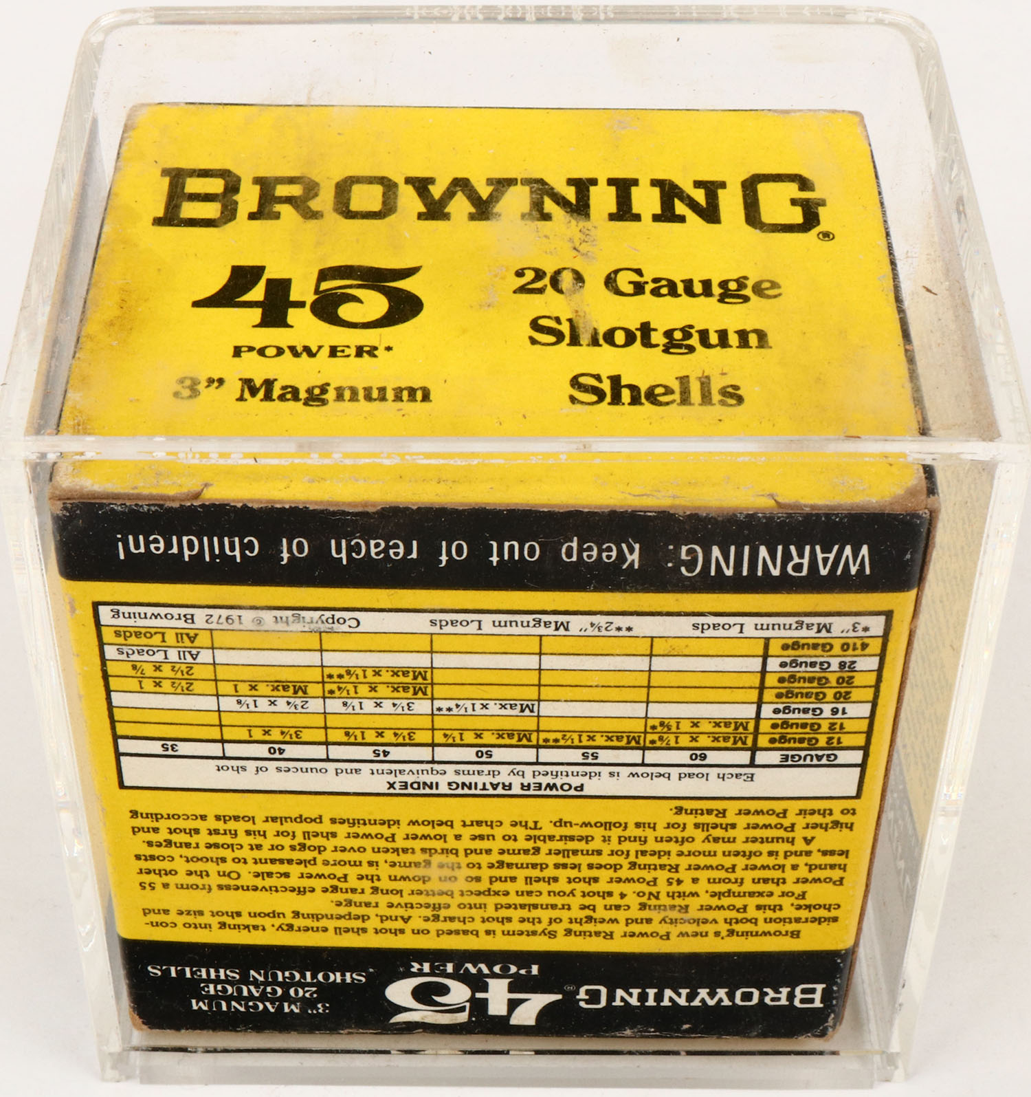 Browning, 45 Power with acrylic box, 20ga., 1pc., FULL, shot size 4, 3 Magnum'', black, yellow & white box, box is solid with nice color, shells are good. Grade: Excellent - Value: 20 to 60