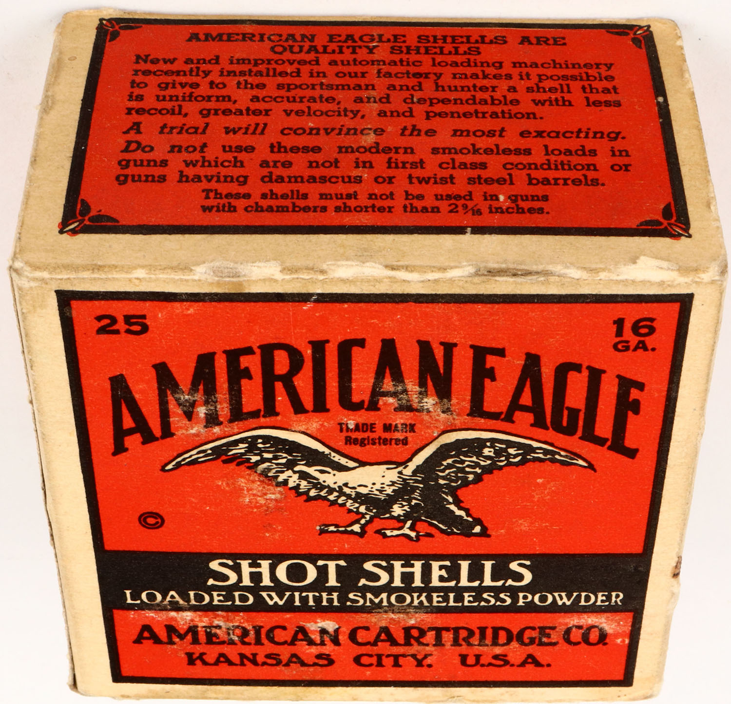 American Cart. Co., XL-Grade, 16ga., 1pc., Full, shot size 8, buff, red & black box that pictures a flying eagle, box has light soiling, mild scuffing, very nice colors, shells are excellent. Grade: Excellent - Value: 30 to 150