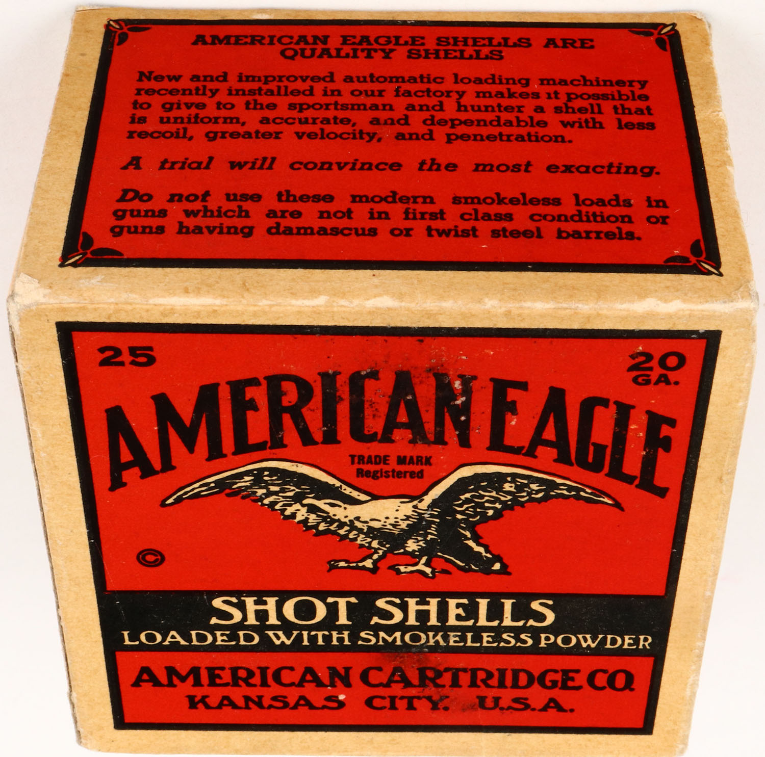 American Cart. Co., XL-Grade, 20ga., 1pc., Full, shot size 9ch Skeet Load, buff, red & black box that pictures a flying eagle, box has light soiling, very nice colors, shells are excellent. Grade: Excellent + - Value: 30 to 150