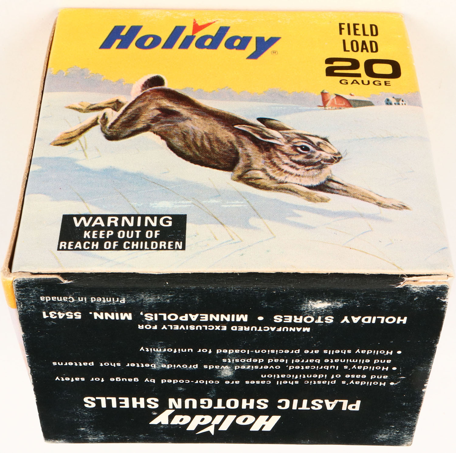Holiday, Grouse/Rabbit Scene, 20ga., 1pc., FULL, 2 3/4'', shot size 8, multi color graphics of Grouse/Rabbit by Les Kouba, box is solid with excellent colors, Shells are very good. Grade: Excellent - Value: 30 to 150