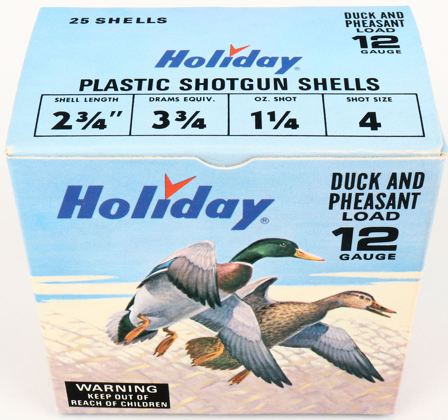 Holiday, Mallards/Pheasants, 12ga, 1pc., Empty, 2 3/4, shot size 4, multi color graphics by Les Kouba, box is very solid with excellent colors. Grade: Excellent + - Value: 20 to 50