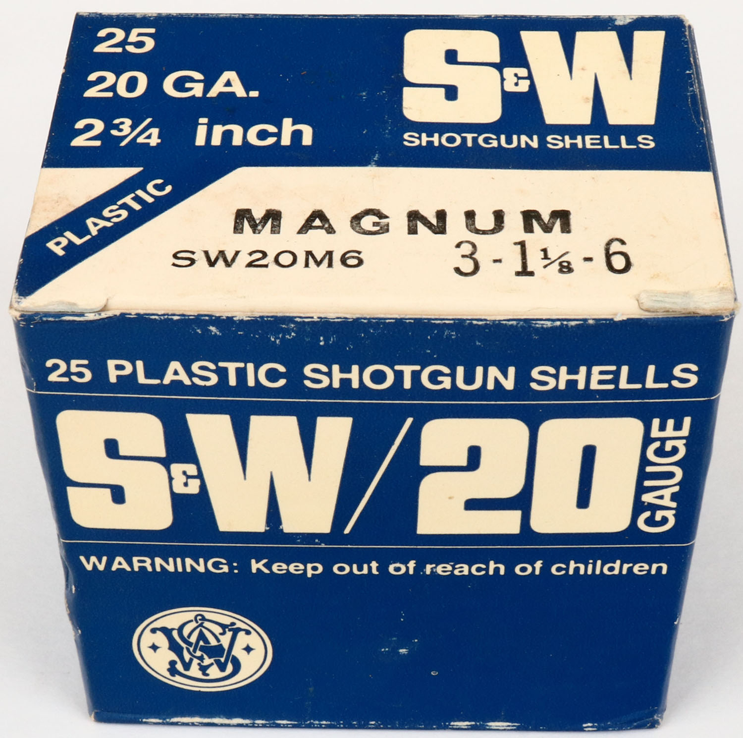 | S&W, 20ga., 1pc., FULL, shot size 6 Magnum, box is solid, Shell...
