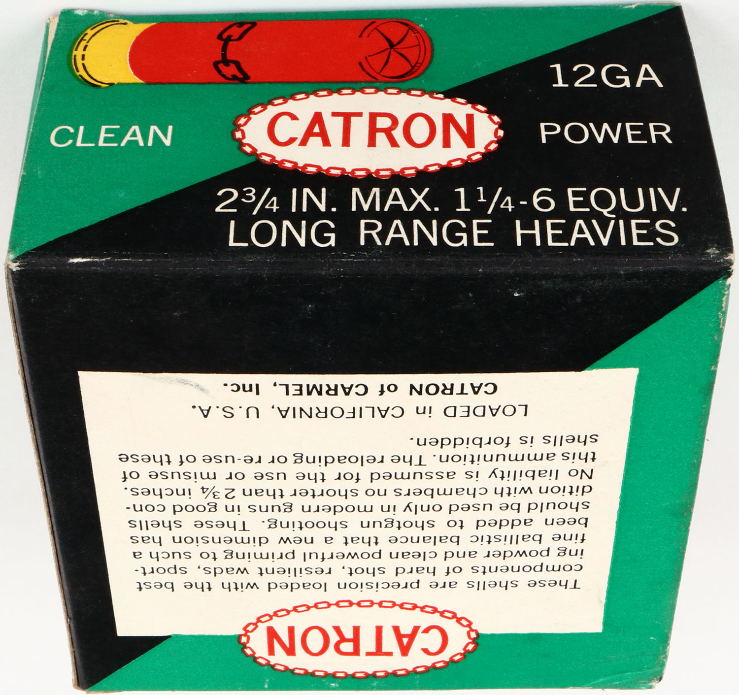 Catron, 12ga., 1pc., FULL, shot size 6, box is solid, Shells are excellent. Grade: Excellent + - Value: 8 to 20
