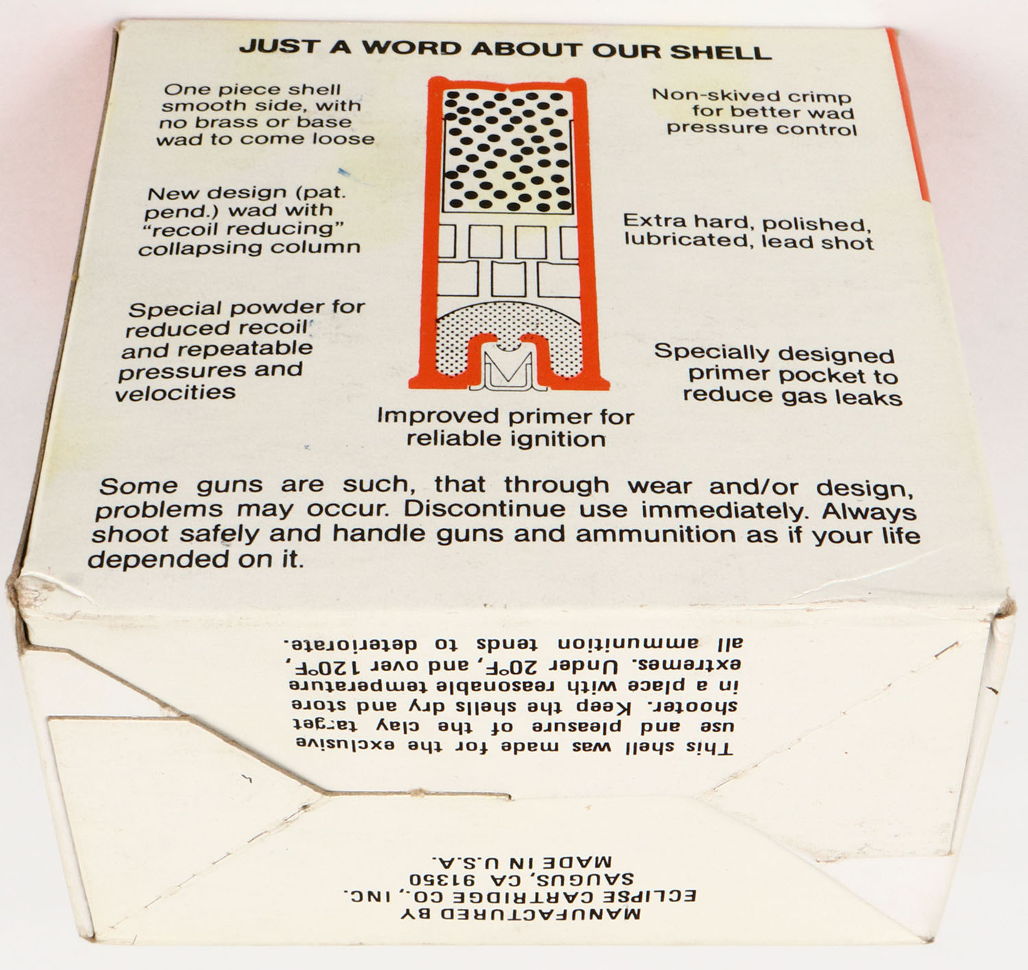 Eclipse, 12ga., 1pc., FULL, shot size 8 Target Loads, box is solid, Shells are excellent. Grade: Excellent + - Value: 8 to 20