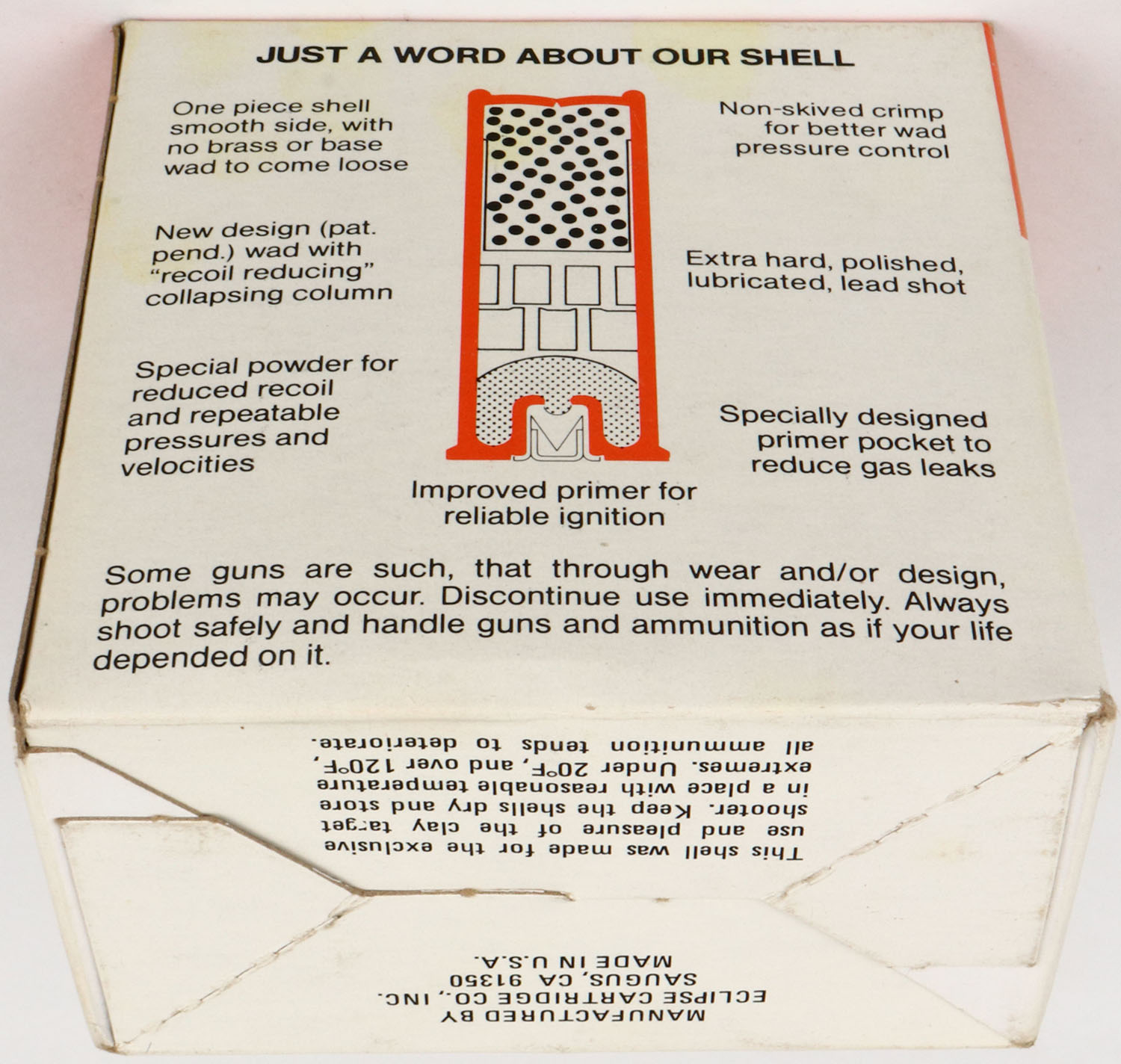 Eclipse, 12ga., 1pc., FULL, shot size 8 Target Loads, box is solid, Shells are excellent. Grade: Excellent + - Value: 8 to 20