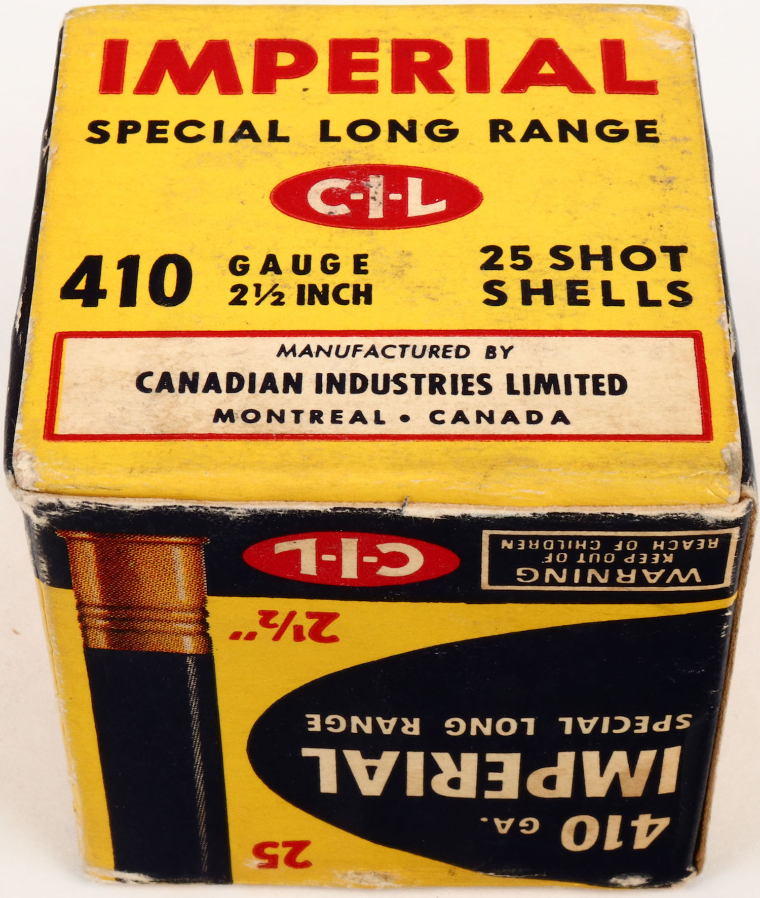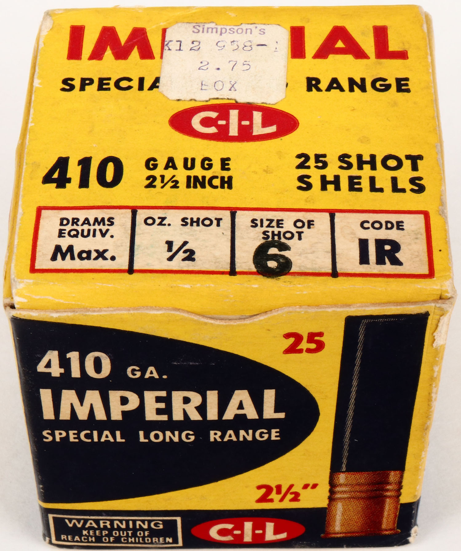 CIL, Imperial, 410ga., 1pc., FULL, shot size 6, box is solid, Shells are excellent. Grade: Excellent + - Value: 8 to 20