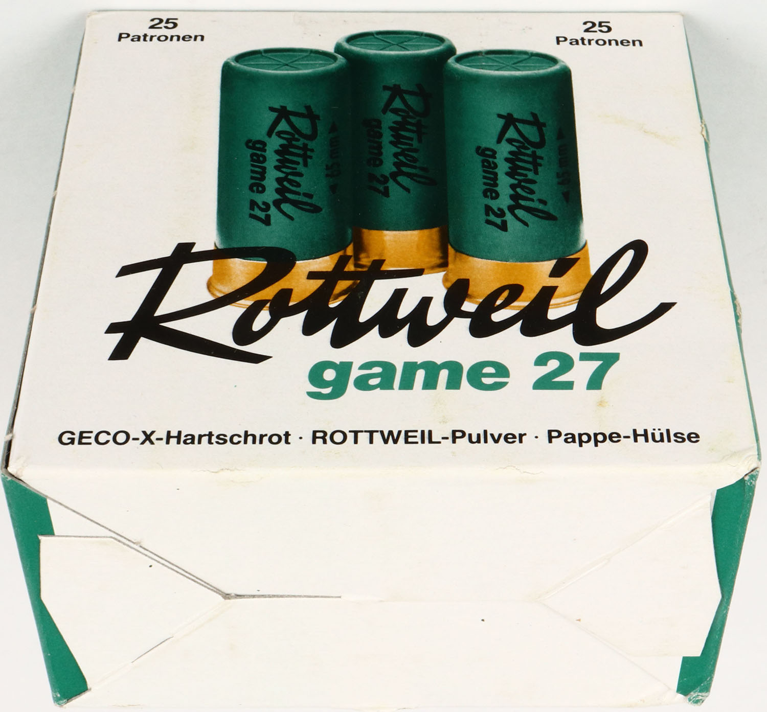 Rottweil, Game 27, 12ga., 1pc., FULL, shot size 6, box is solid, Shells are excellent. Grade: Excellent + - Value: 8 to 20