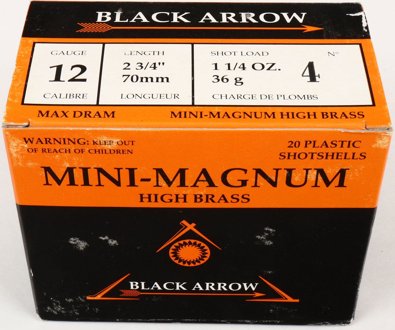Black Arrow, 12ga., 1pc., FULL, shot size Mini-Magnum 4, box is solid, Shells are excellent. Grade: Excellent + - Value: 8 to 20