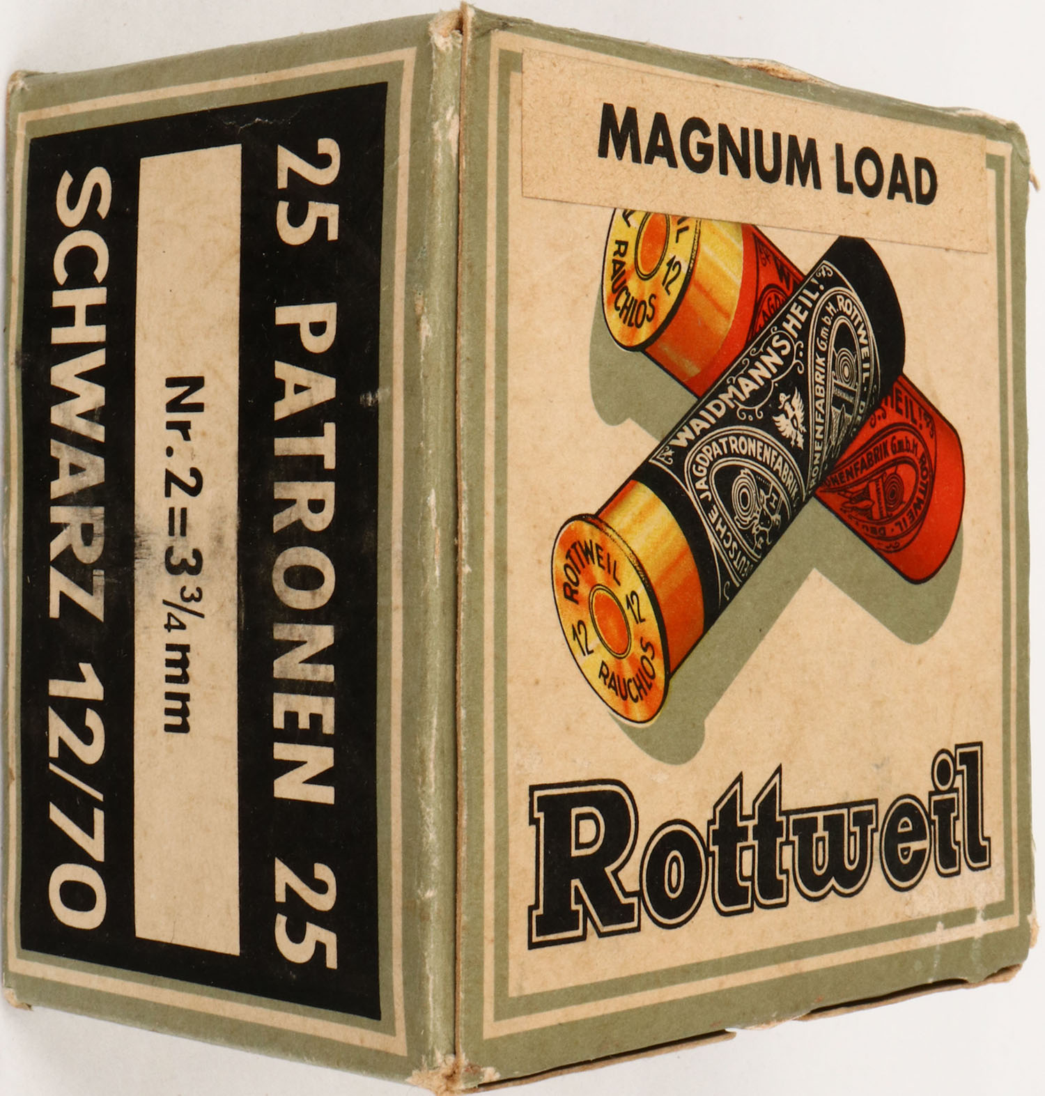 Rottweil, with insert, 12ga., 1pc., Partial 23rds, shot size 2 Magnum Load, box is solid, Shells are excellent. Grade: Excellent + - Value: 8 to 20