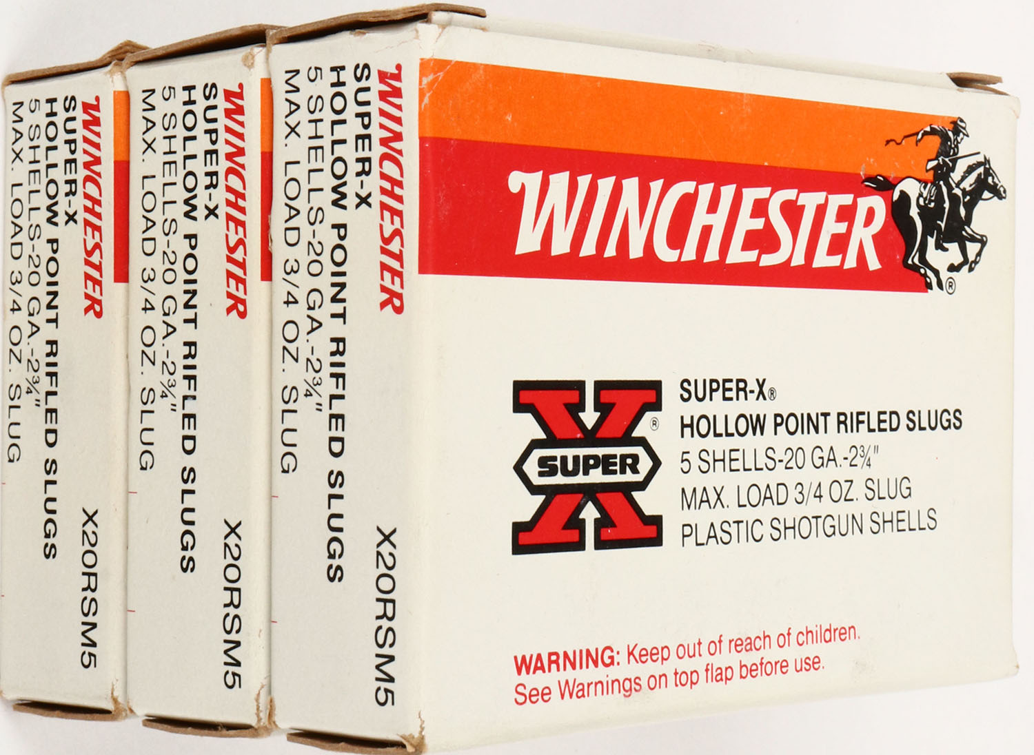 Lot of 3 Winchester Super X, 20ga., 1pc., FULL, shot size Hollow Point Rifled Slugs, boxes are solid, Shells are excellent. Grade: Excellent + - Value: 10 to 30