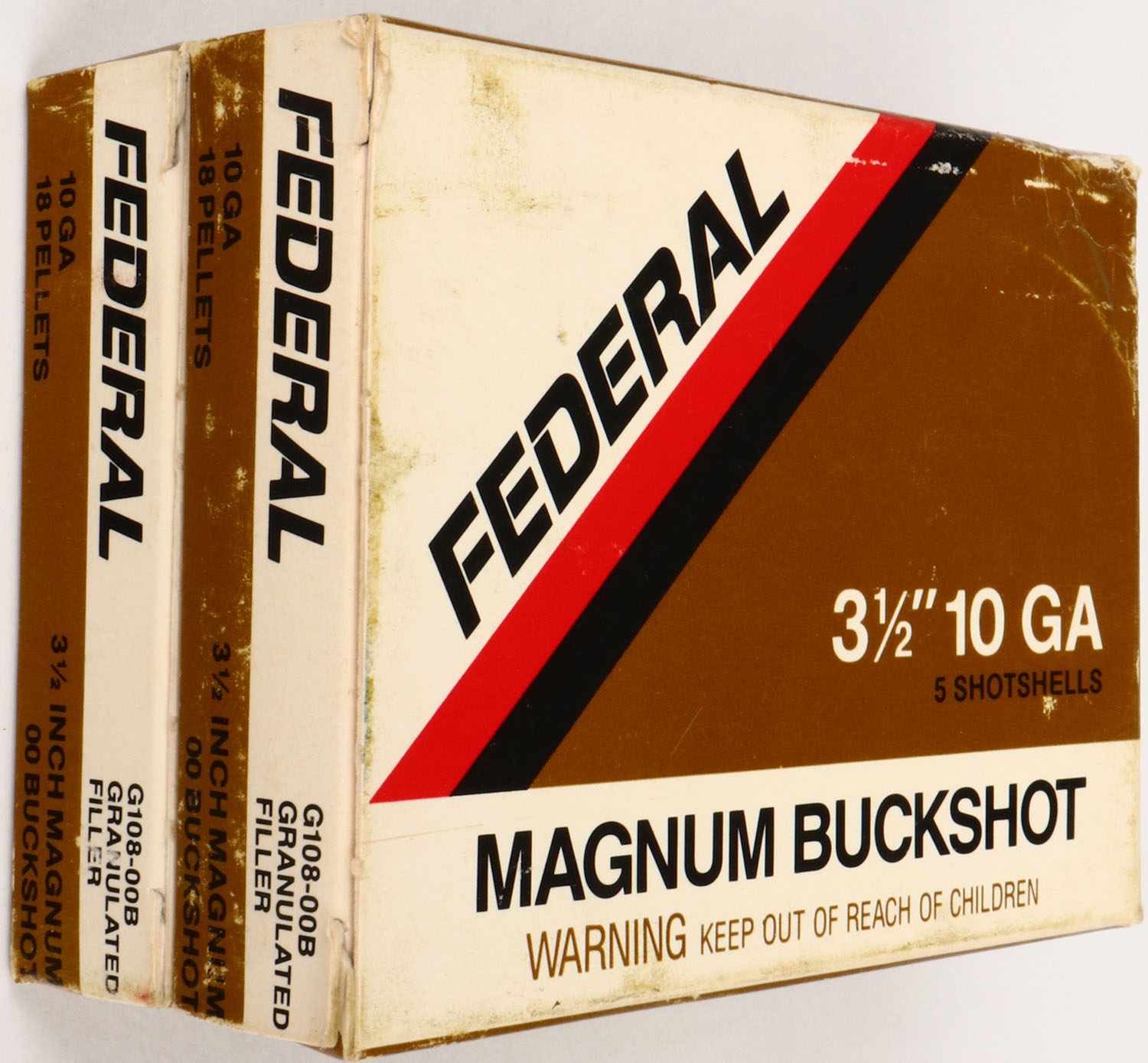 Lot of 2 Federal, 10ga., 1pc., FULL, shot size Magnum Buckshot, boxes are solid, Shells are excellent. Grade: Excellent + - Value: 6 to 16
