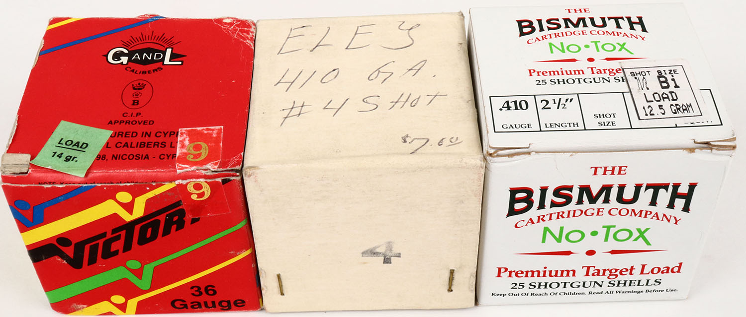 Lot of 3 Eley/Bismuth/G & L, 410ga., 1pc., FULL, shot size 9, 4 & 7 1/2, boxes are solid, Shells are excellent. Grade: Excellent + - Value: 16 to 50