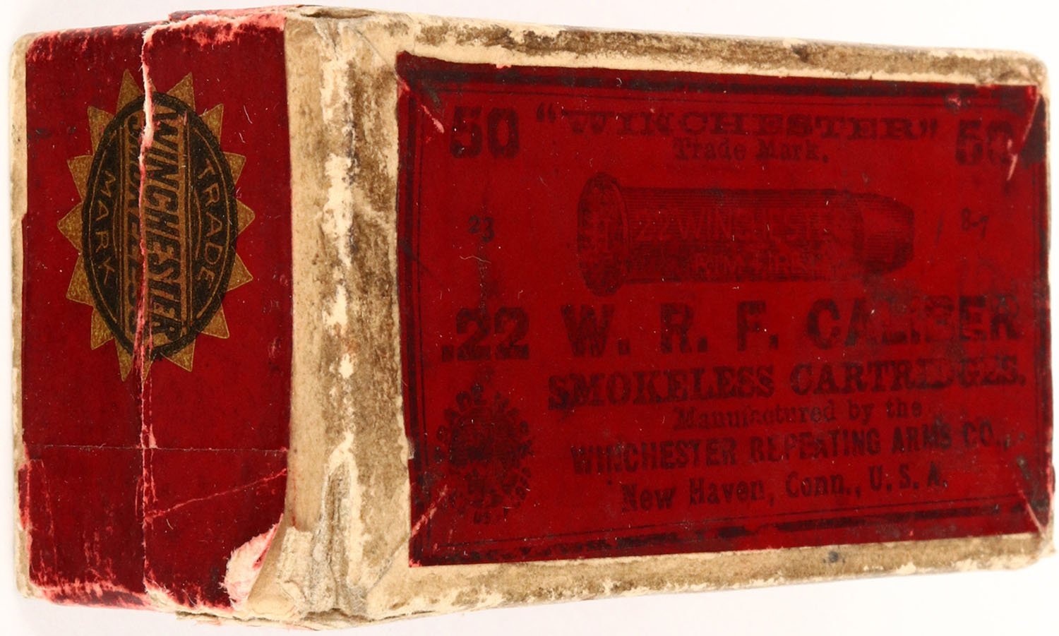 Winchester, .22 W.R.F. Caliber, Smokeless Cartridges, 1906 issue, RR: WRA-152 WRF-13a, Full, 2pc. buff box with purple & black labels, box is solid with good color, 2 seam splits to left end of lid, age soiling, some edge wear, printing on top faded, ammo is very good. Grade: Very Good ++ - Value: 30 to 120