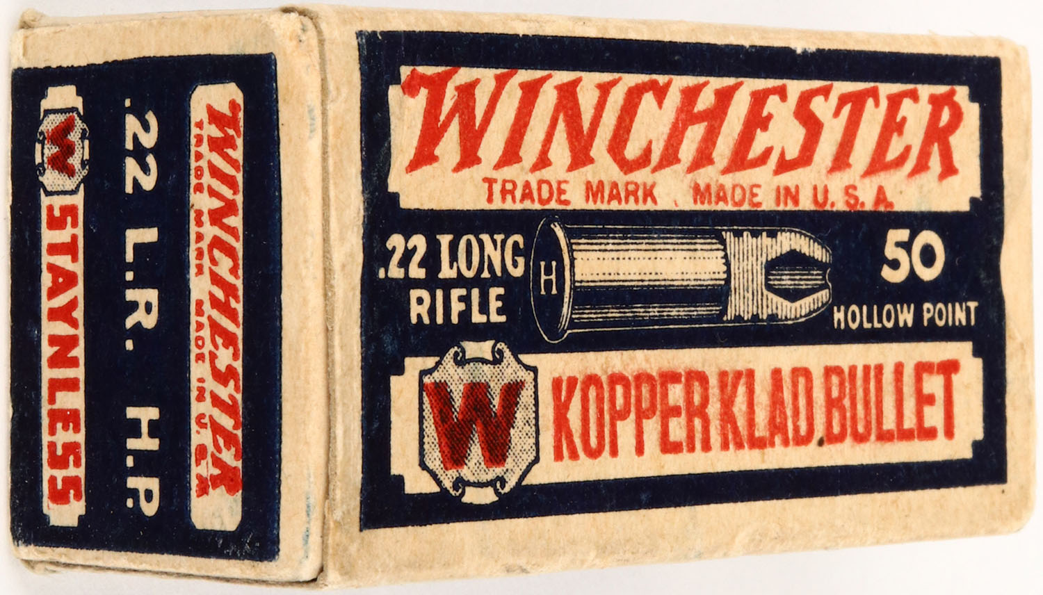 Winchester, Kopper Klad Bullet, .22 Long Rifle Hollow Point, RHWeb: WRA-12.5 LR-2a, Partial 49rds., 1pc. Blue white & red box, box is solid with minty color, very minor edge & corner wear, end flaps are rigid, ammo is excellent. Grade: Excellent ++ - Value: 60 to 180