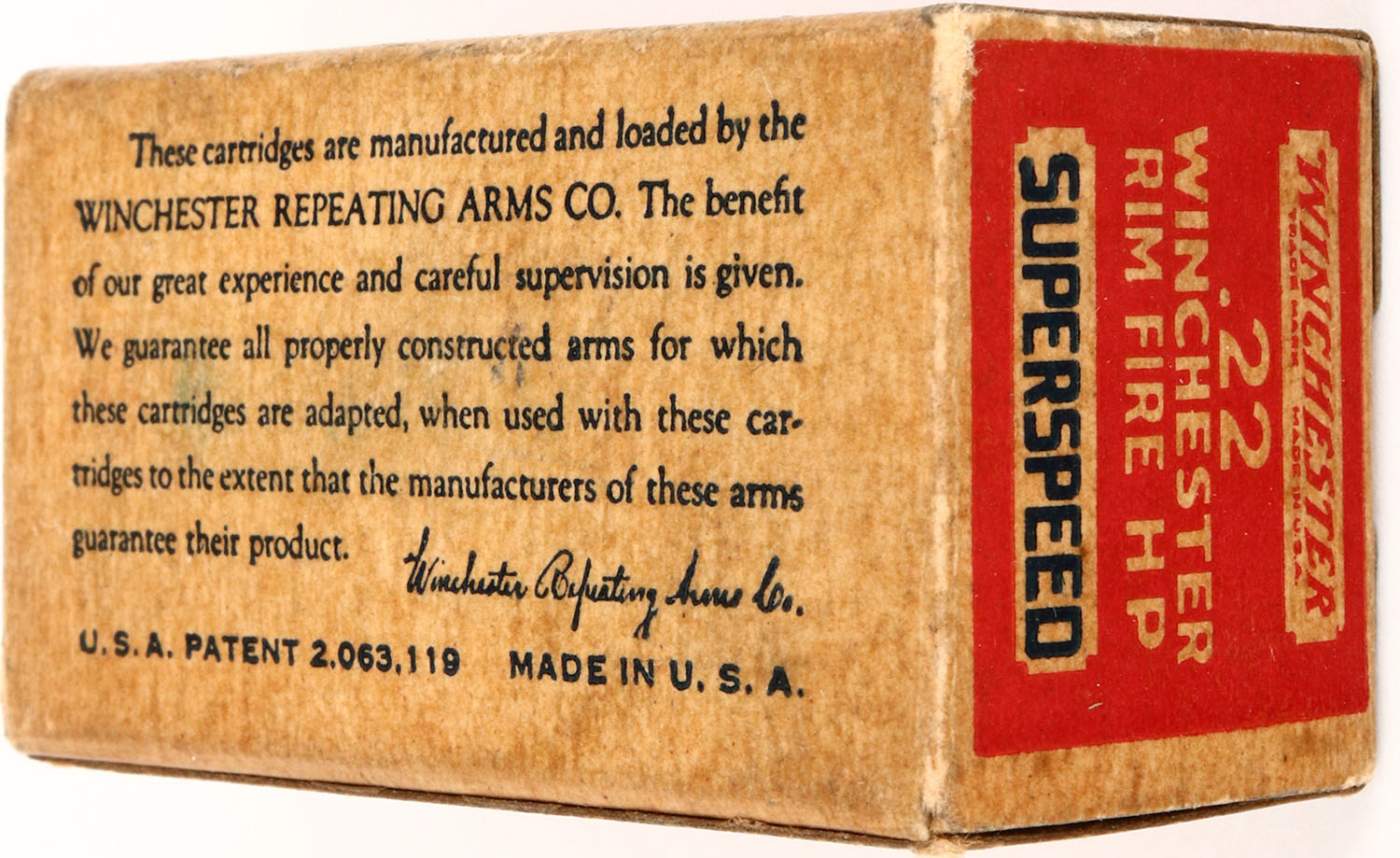 Winchester, Super Speed Staynless, .22 W.R.F., RHWeb: WRA-13 WRF-1a, Full, 1pc. Red buff & blue box, box is solid with very good color, age soiling, very minor corner wear, edges are mostly crisp, ammo is very good to excellent. Grade: Very Good ++ - Value: 20 to 100