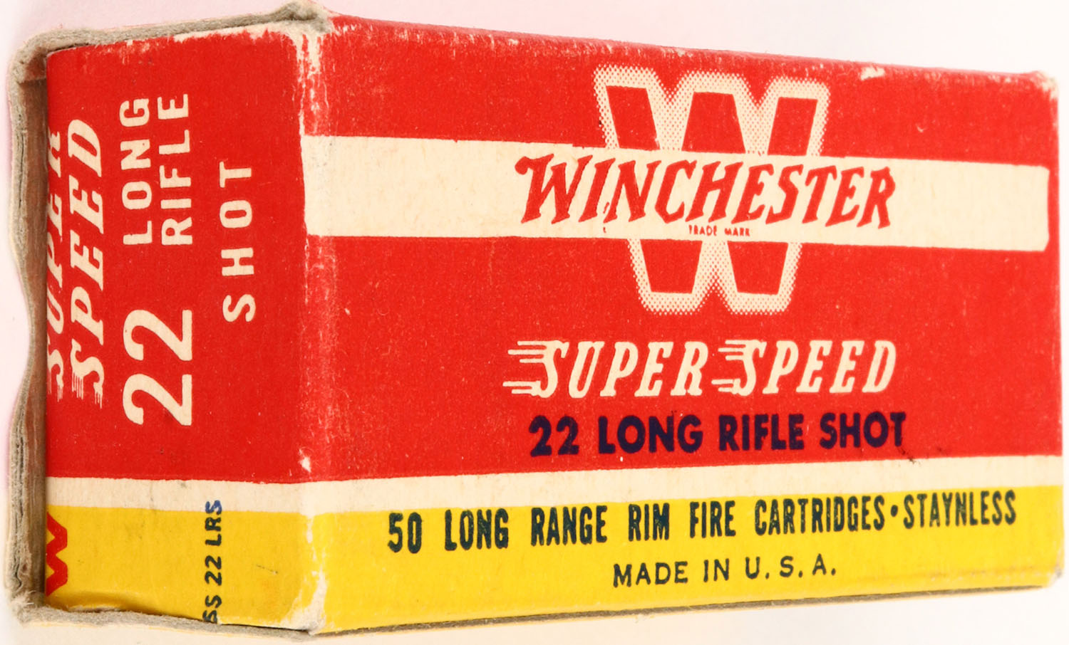 Winchester, Super Speed, .22 Long Rifle Shot, RHWeb: WRA-17 LR-5d, Full, 1pc. Red yellow & white box, box is solid with excellent color, very minor corner wear, edges are crisp, end flaps are rigid, ammo is excellent. Grade: Excellent ++ - Value: 8 to 40