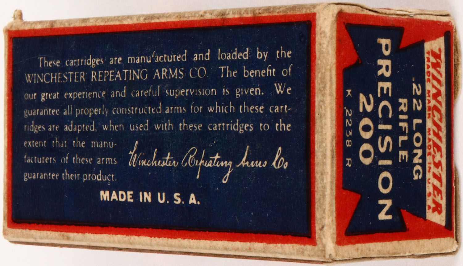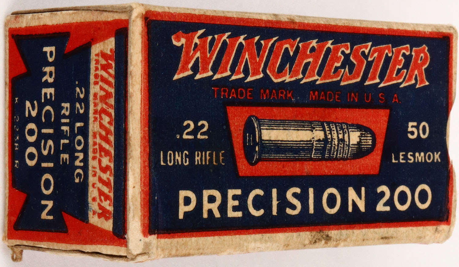 Winchester, Precision 200, .22 Long Rifle, Target Cartridges, RHWeb: WRA-53 LR-11b, Full, 1pc. Blue red & white box, box is solid with excellent color, some corner wear, very minor edge wear & age soiling, edges are mostly crisp, end flaps are fairly rigid, ammo is very good. Grade: Excellent - Value: 30 to 120