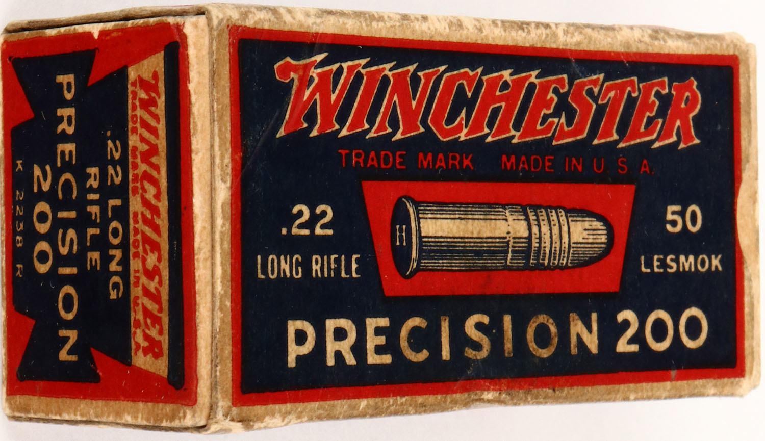 Winchester, Precision 200, .22 Long Rifle, Lesmok, RHWeb: WRA-53 LR-11d, Full, 1pc. Blue red & white box, box is solid with excellent colors, age soiling to white edges, ammo is excellent. Grade: Excellent - Value: 30 to 120
