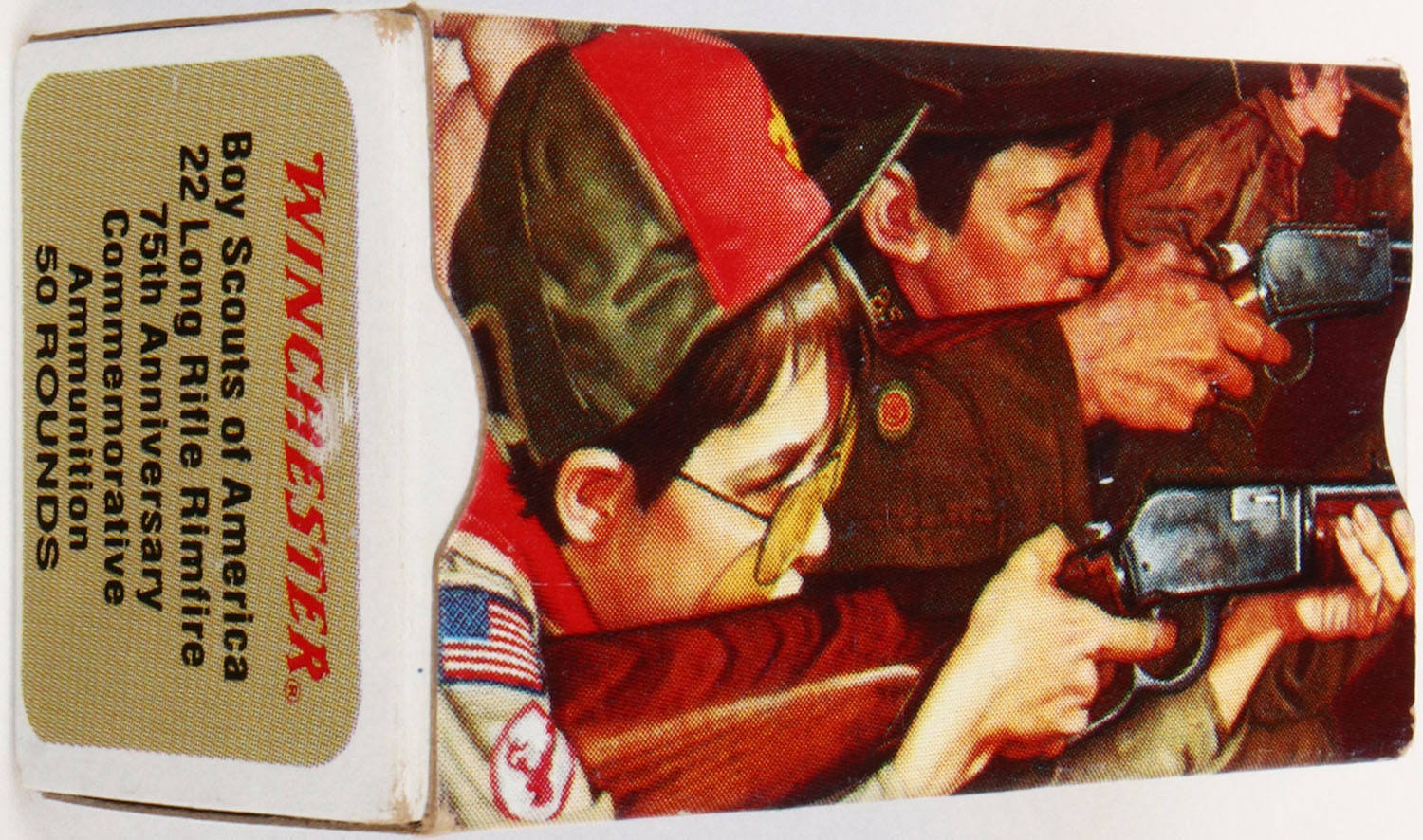 Winchester, Boy Scouts of America 75th Anniversary, .22 Long Rifle, RHWeb: WRA-70 LR-1, Full, 1pc. Multicolored box, box is mint with minty color, sharp corners, crisp edges, rigid end flaps, ammo is minty. Grade: Mint - Value: 10 to 50