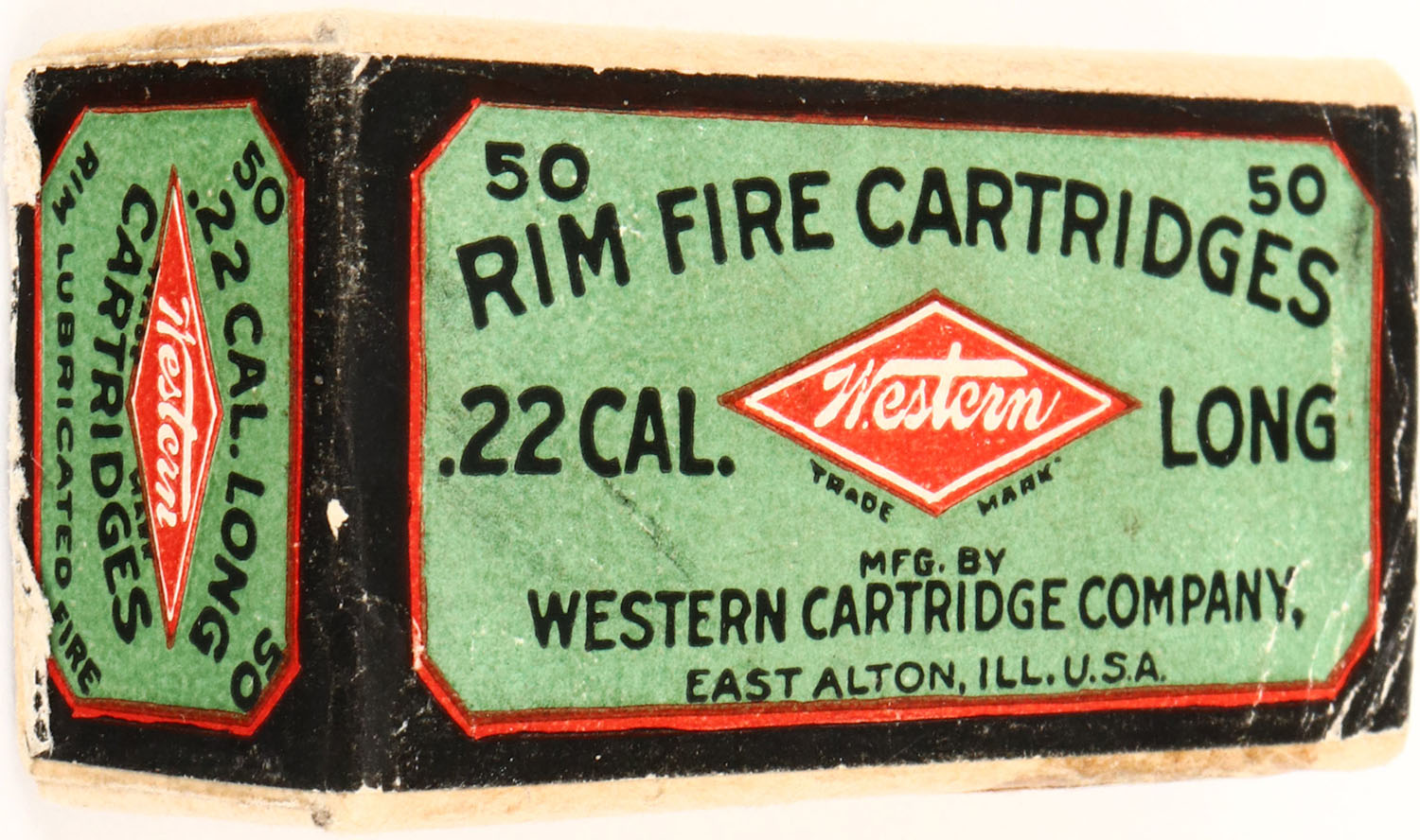 Western, .22 Long, Lubricated, RHWeb: WCC-2 L-2, Full, 2pc. Buff box with green blue & red wraparound label, box is solid with excellent color, very minor age soiling, some edge wear, small stain to front of box, very minor corner wear, labels are intact, ammo is very good. Grade: Excellent - Value: 20 to 80