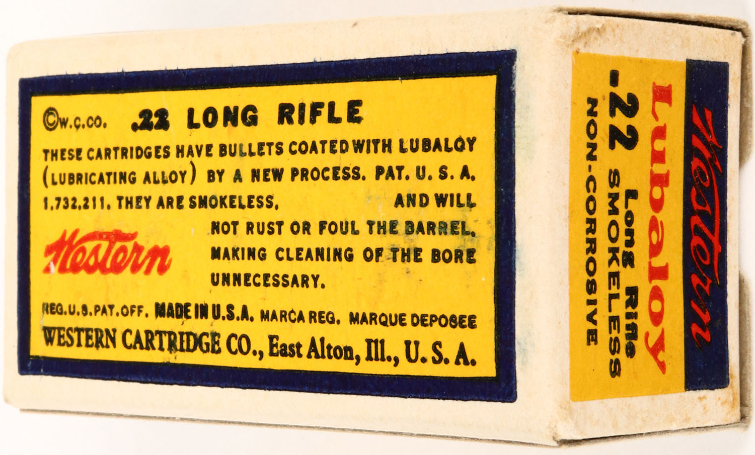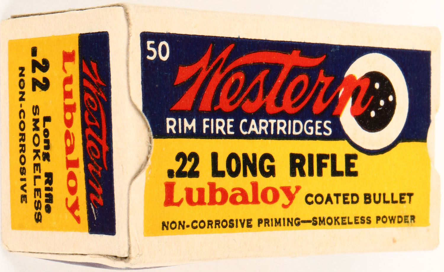 Western, .22 Long Rifle, RHWeb: WCC-4.4.3B LR-2e, No Army Lot, Full, 1pc. Yellow blue & red box, box is near mint with minty color, only very minor corner wear, very minor shelf wear, edges are crisp, end flaps are rigid, ammo is excellent to minty. Grade: Excellent ++ - Value: 10 to 50
