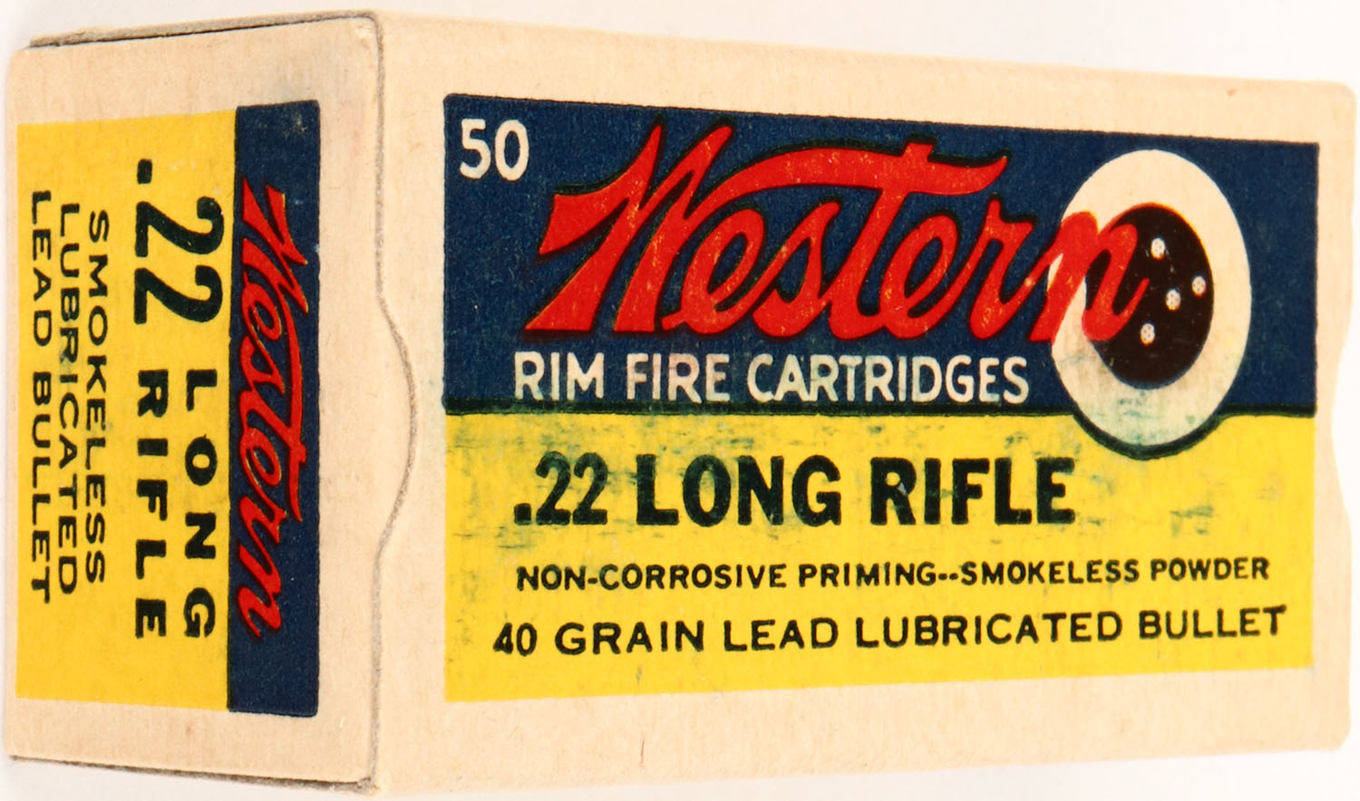 Western, .22 Long Rifle, Smokeless, RHWeb: WCC-4.3B LR-1a, Full, 1pc. Yellow blue & red box, box is solid with excellent to minty color, minor shelf wear, corners are sharp, edges are crisp, end flaps are solid, ammo is excellent. Grade: Excellent ++ - Value: 10 to 50