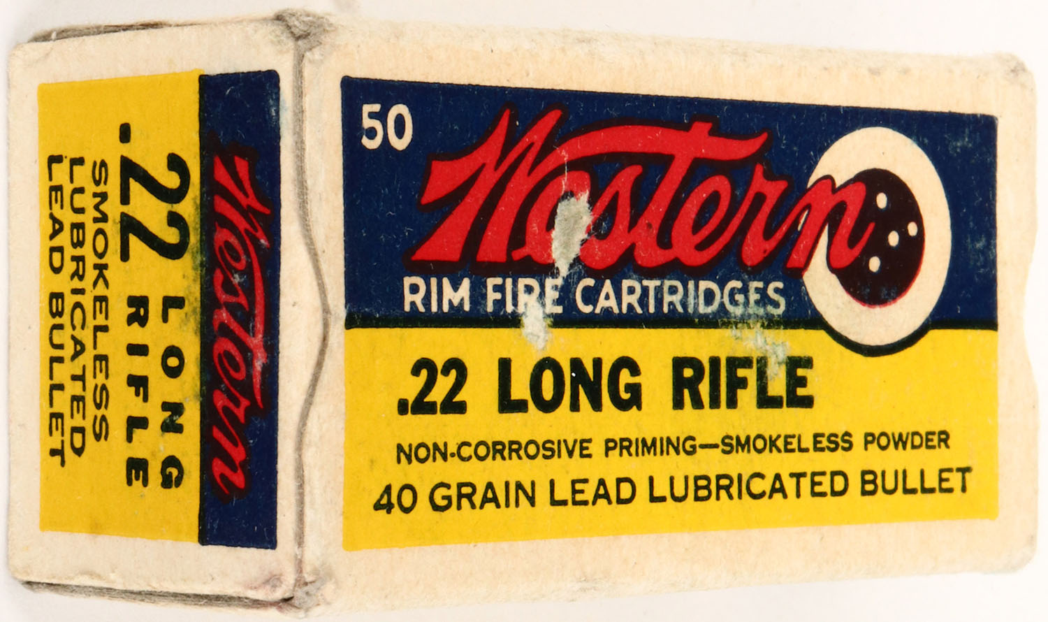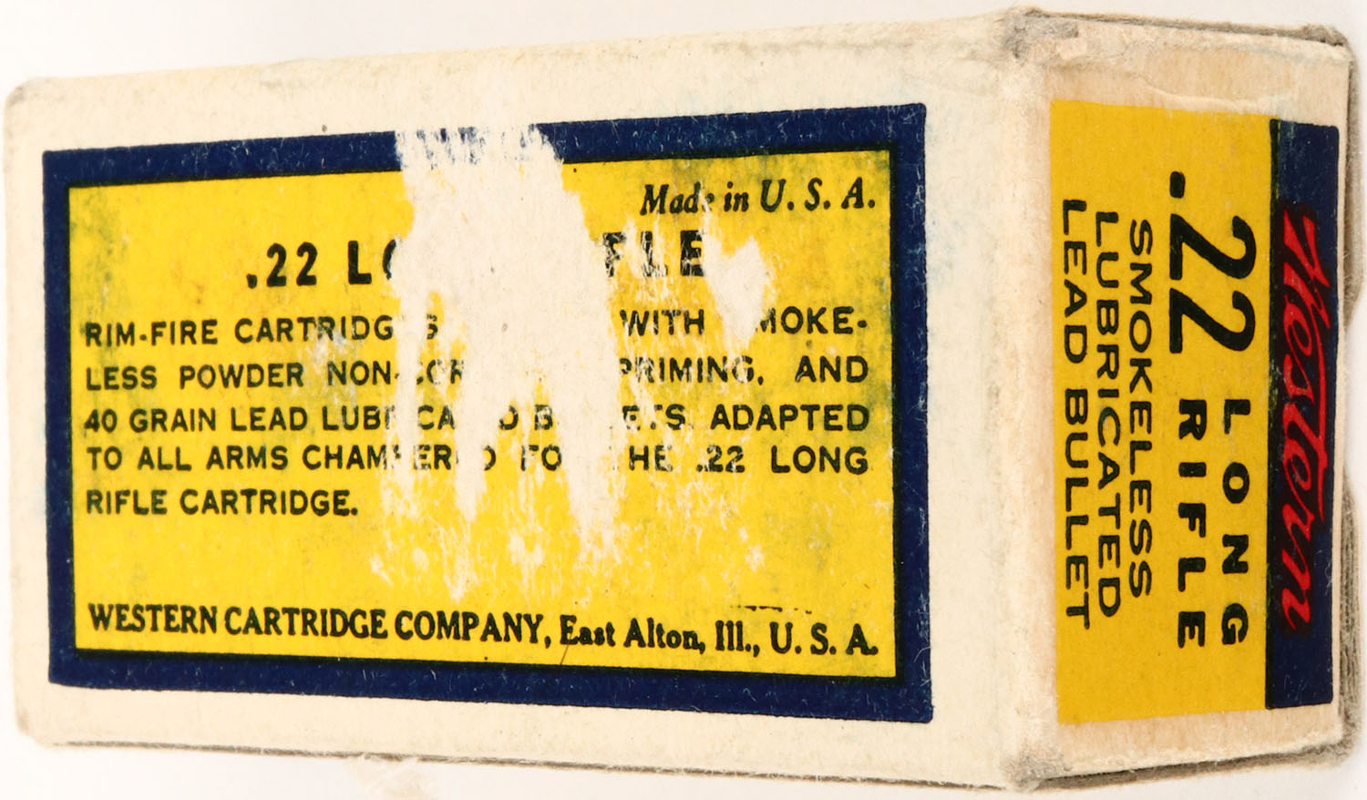 Western, .22 Long Rifle, Lead Lubricated, RHWeb: 4.3B LR-1h, Full, 1pc. Yellow blue & red bullseye box, box is solid with excellent color, some scuffing to the top & bottom, some corner & edge wear, end flaps are solid, ammo is very good to excellent. Grade: Excellent - Value: 8 to 40