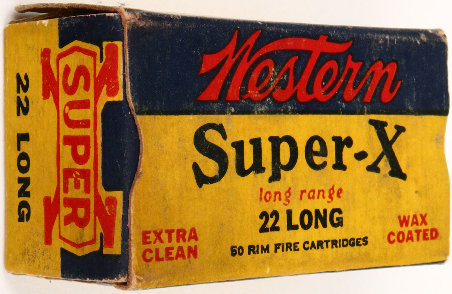 Western, Super-X, .22 Long Hollow Point, RHWeb: (Super-X Longs) WCC-12 L-22, Full, 1pc. Yellow blue & red box, box is solid with excellent color, minor age soiling, very minor corner & edge wear, end flaps are rigid, ammo is excellent. Grade: Excellent - Value: 8 to 40