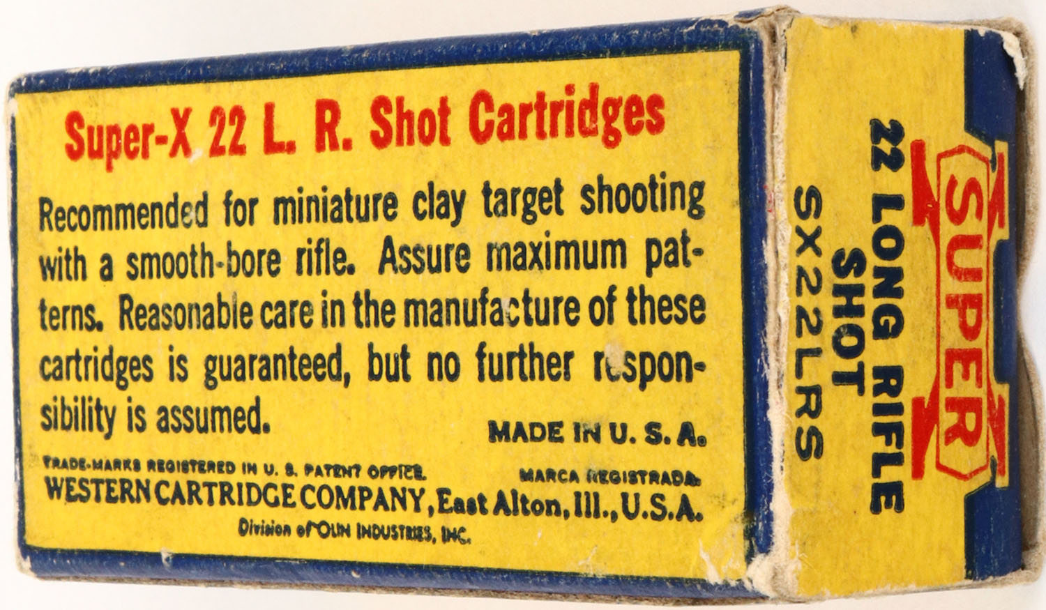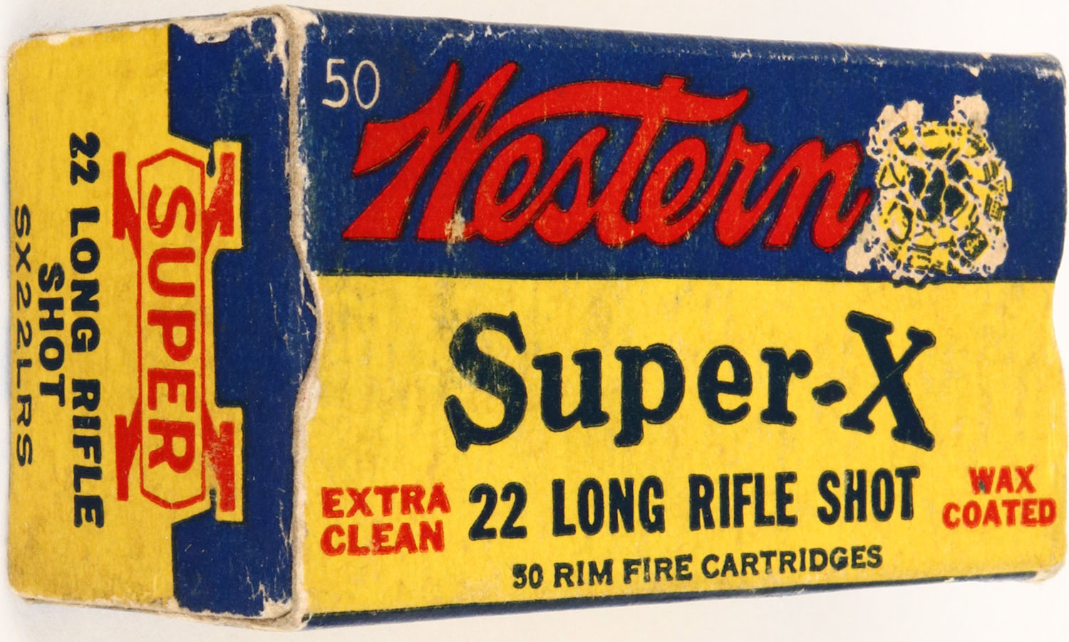 Western, Super-X, Long Rifle Shot, RHWeb: (Super-X Long Rifle) WCC-48 LRS-20, Full, 1pc. Yellow blue & red box, box is solid with excellent color, very minor edge & corner wear, end flaps are fairly rigid, ammo is excellent. Grade: Excellent + - Value: 8 to 40